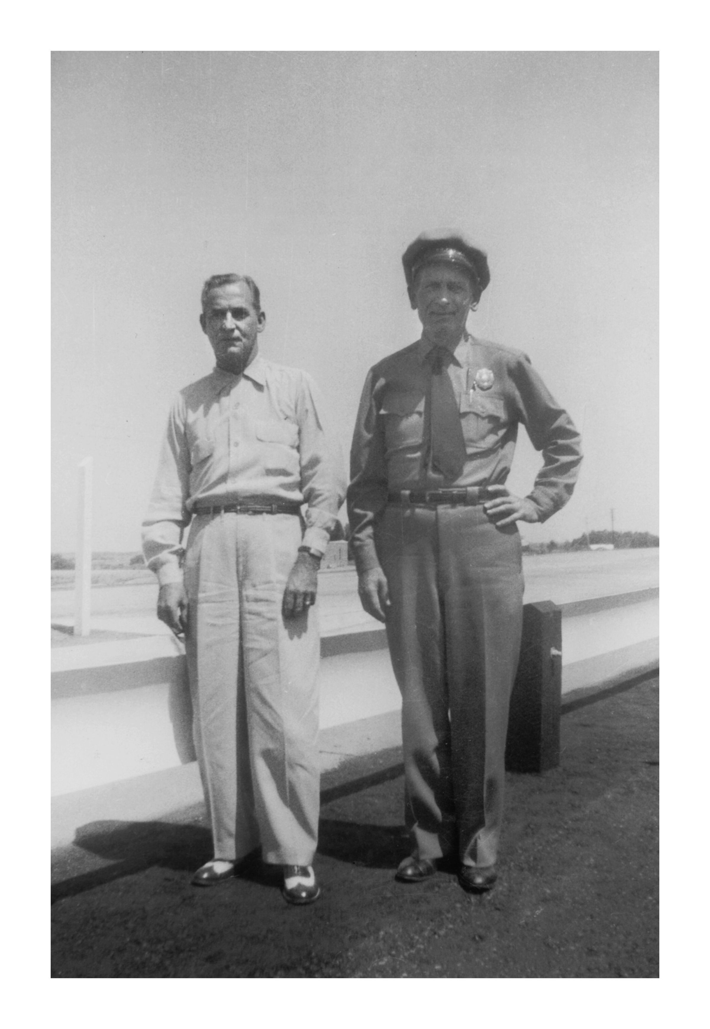 Black and white photograph of two men. One wears a tollbooth worker's uniform, the other wears lighter clothes.