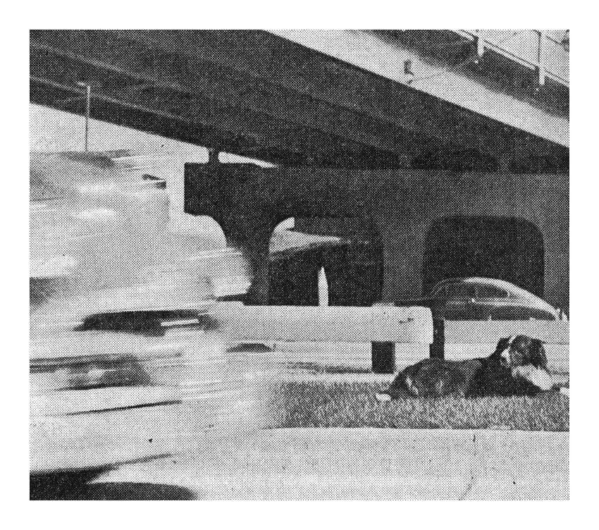 Shep the Tollbooth Dog lying down on a patch of grass as a car passes by in the background. On the left side of the image there seems to be something blurred that is going by.