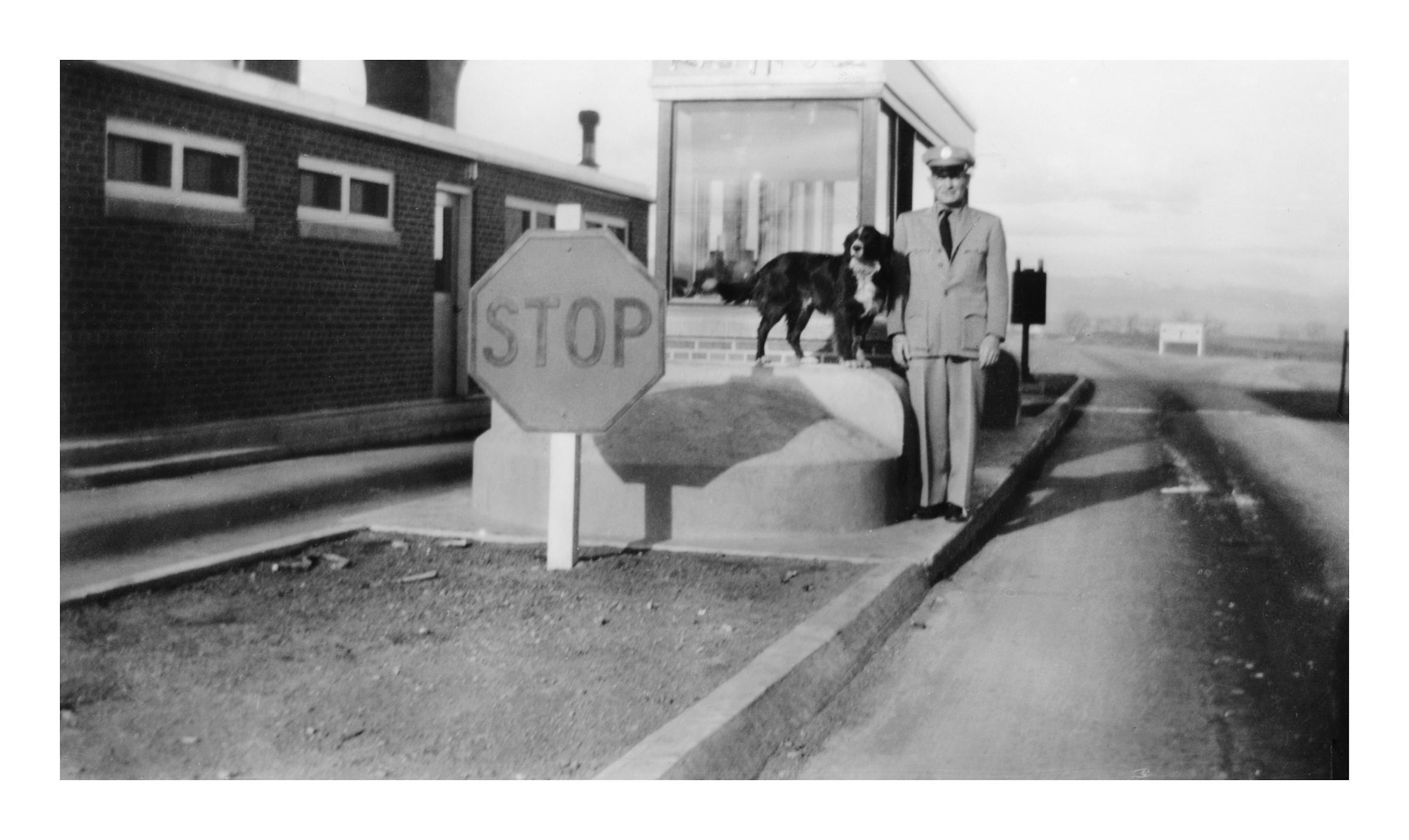 Shep the Tollbooth Dog standing next to another tollbooth worker. The photograph is taken during the day, with a stop sign visible beside them.