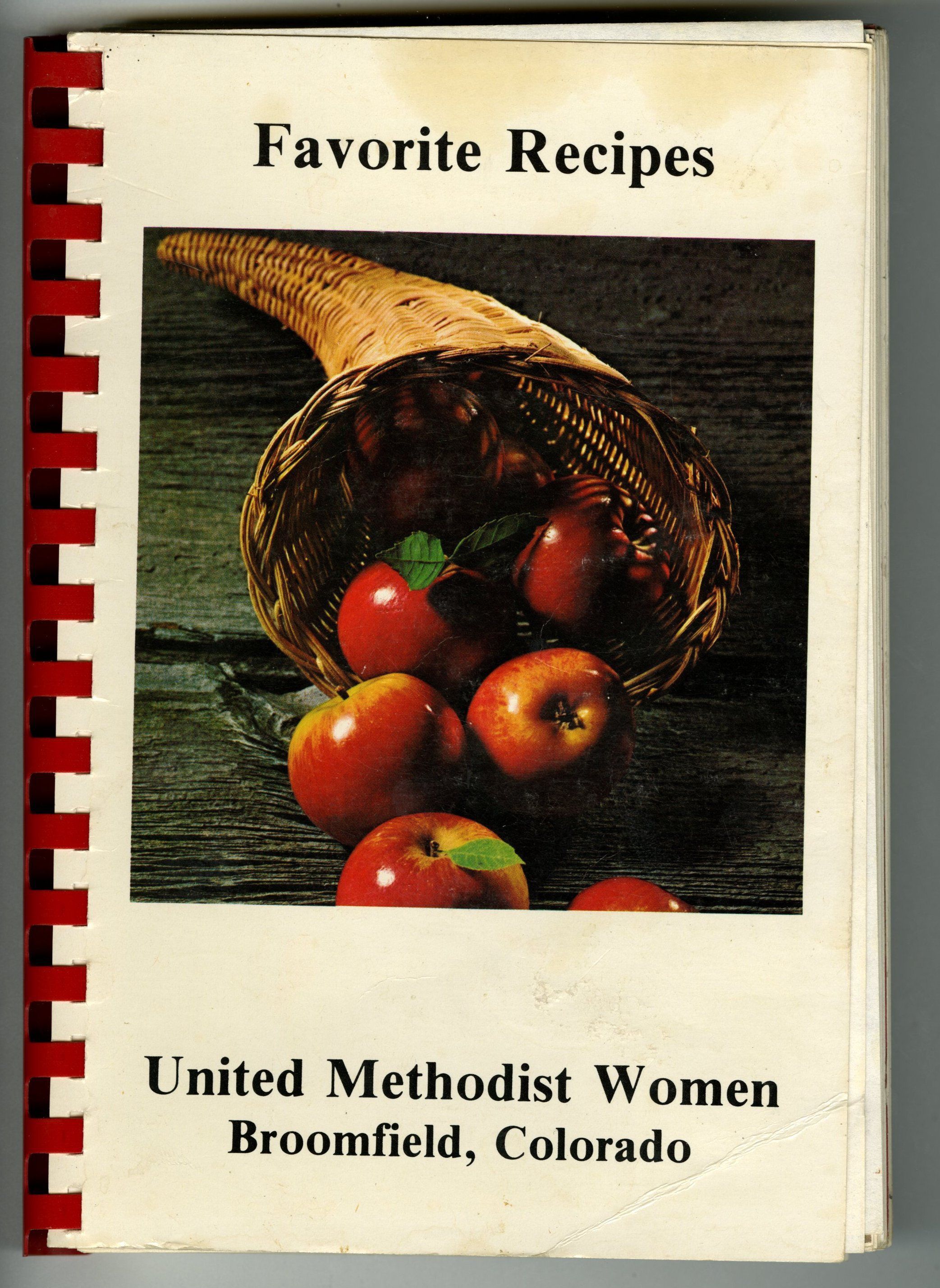 Cookbook compiled by the United Methodist Women with seven chapters: Appetizers Pickles Relishes; Soups Salads Vegetables; Main Dishes; Breads Rolls Pastry; Cakes Cookies Desserts; Candy Jelly Preserves; Beverages and Miscellaneous. Red comb binding, cardstock cover with a cornucopia with apples on the front, 239 pages, 9" (H) x 6.5" (W)
