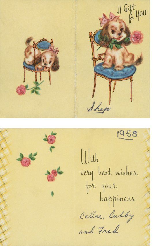 Photo of a get-well card that was sent to Shep the Tollbooth Dog in 1958 after he was shot in the leg and recovering. Image on fron tof the cover features a dog sitting on a chair, a pink rose in her mouth, reads "A Gift for You / With very best wishes for your happiness / Callae, Cubby and Fred." Two photographic prints, one of front of teh card, the other of the back.Collection