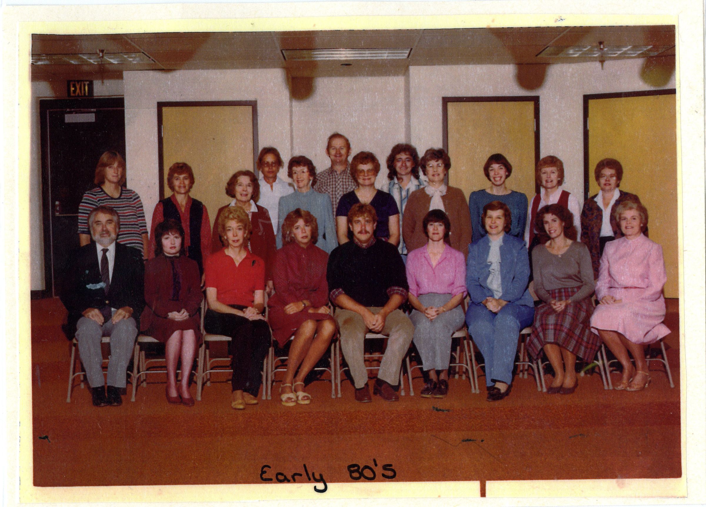 Early 80s photo of the staff at Emerald Elementary. The photo is laminated, with "Early 80's" written on the bottom. The photo is otherwise undated.