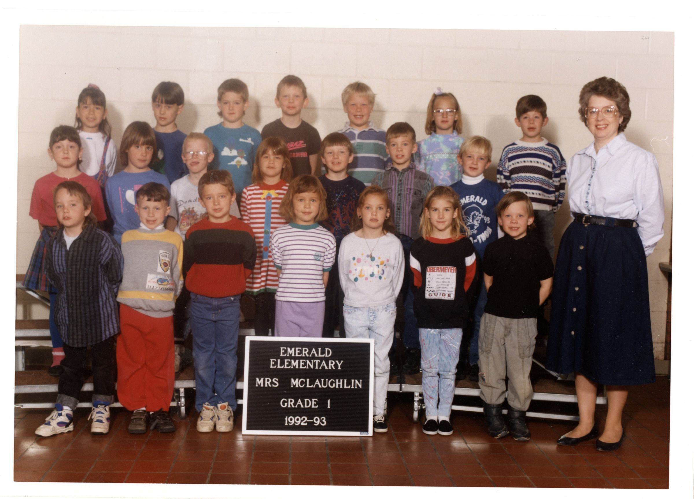 Photo of Mrs. McLaughlin's first grade class at Emerald Elementary. The photo is colored, with a white folded paper protecting it. The photo is not laminated but it is professionally printed.