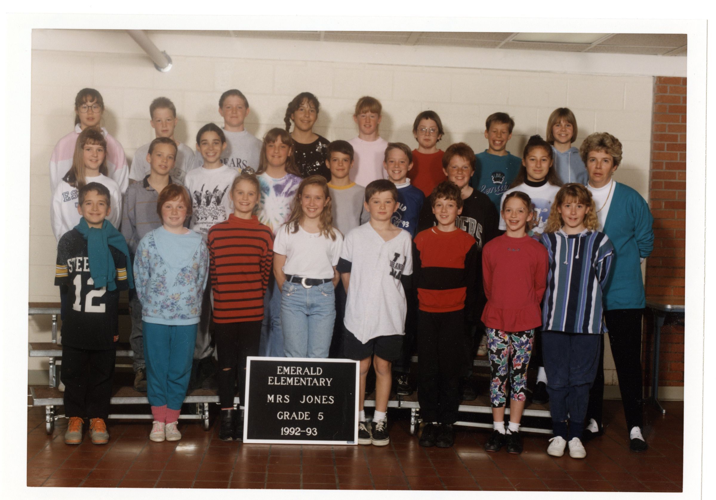 Class photo of Mrs. Jones' 1992-1993 5th grade class at Emerald Elementary. Photo is colored with white folder/frame around it. Plaque in photo reads "Emerald Elementary, Mrs. Jones Grade 5 1992-93".