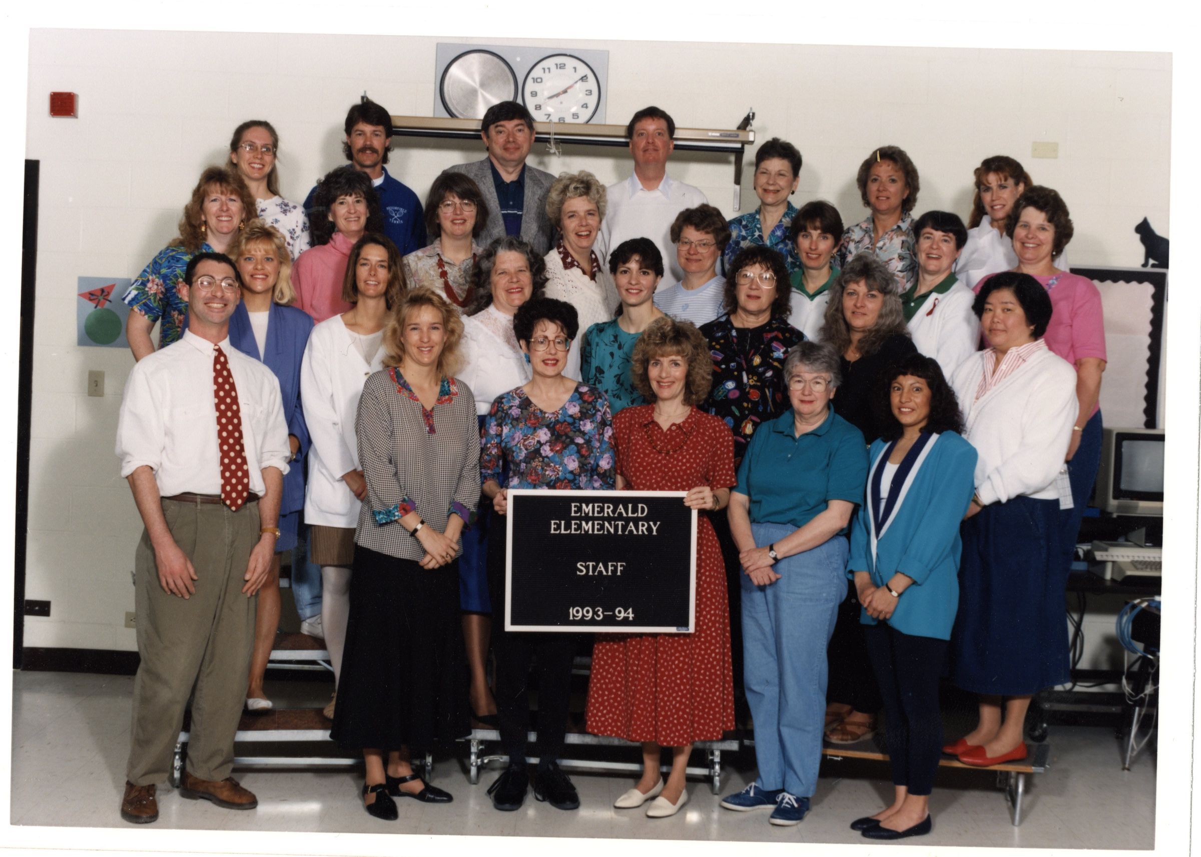 Staff photo of Emerald Elementary during the school-year 1993-94. The two middle teachers in the front row are holding the plaque that reads "Emerald Elementary STAFF 1993-94". The photo is colored.