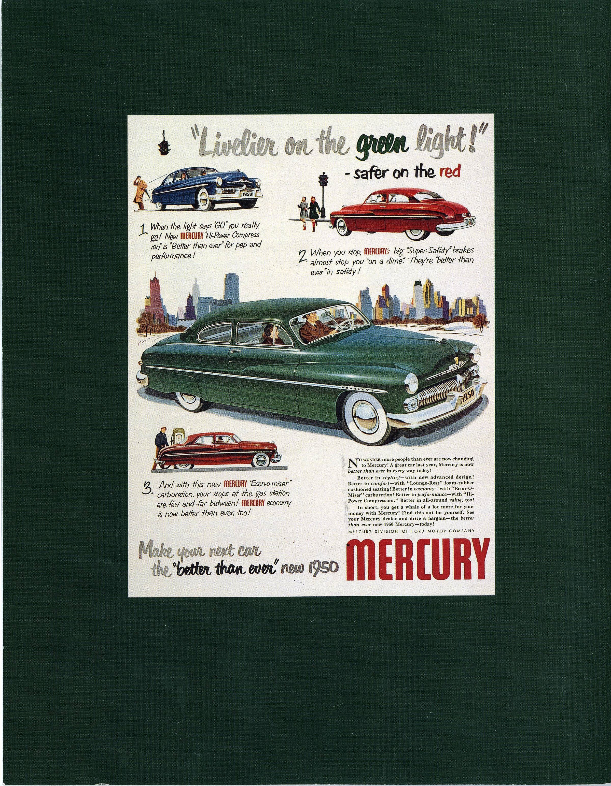 8.5" x 11", with a color photographic image of a 1950 Mercury four-door coup, dark purple with flame decals on the cover. Rock formations are visible in the background. The reverse cover is green with a color advertisement of the 1950 Ford Mercury cars.Collection
