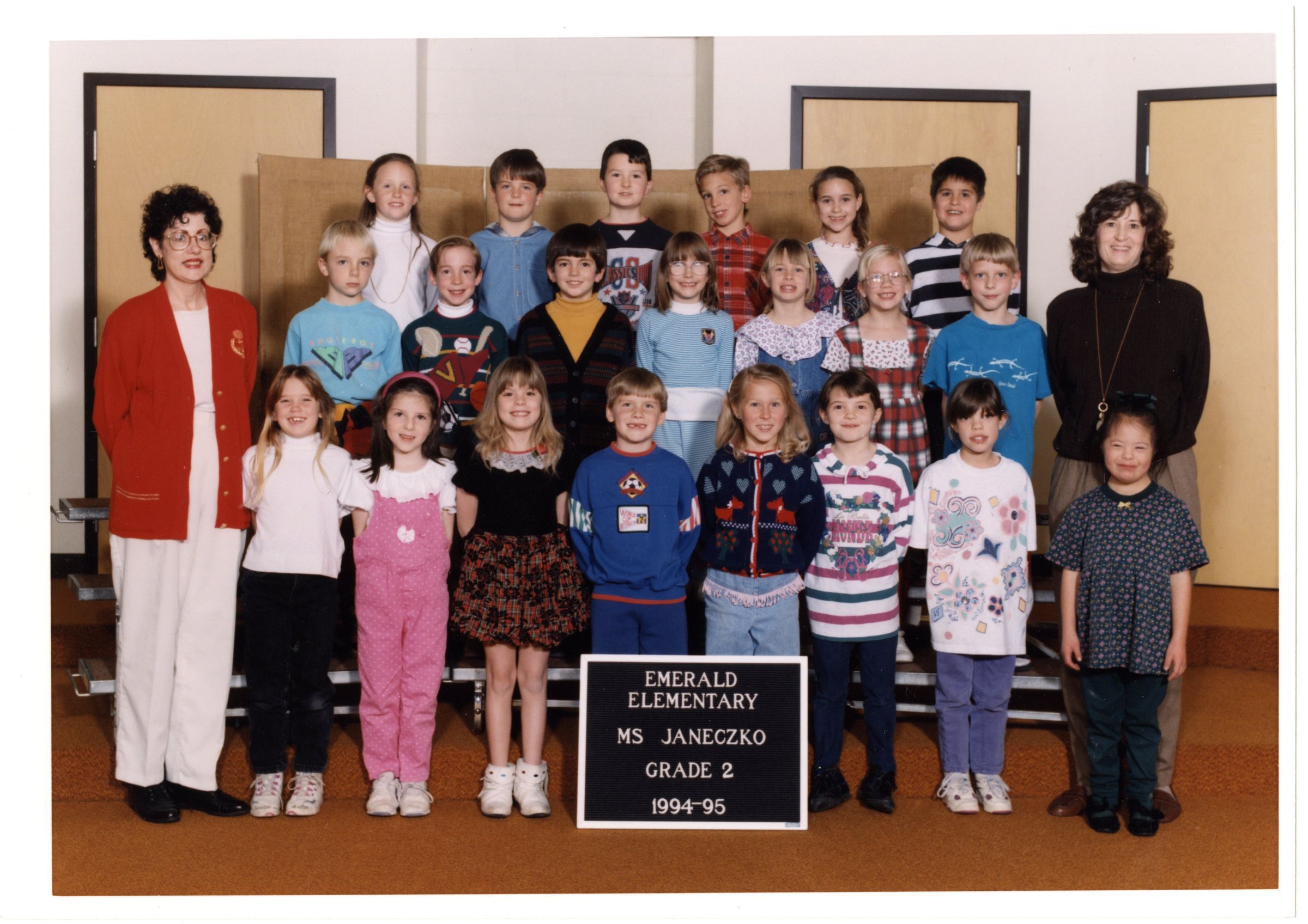 Photo of Ms. Janeczko's second grade class of 1994-1995 at Emerald Elementary. Colored photo, white paper folded around it. Plaque reads "Emerald Elementary, Ms. Janeczko, Grade 2, 1994-95"Collection