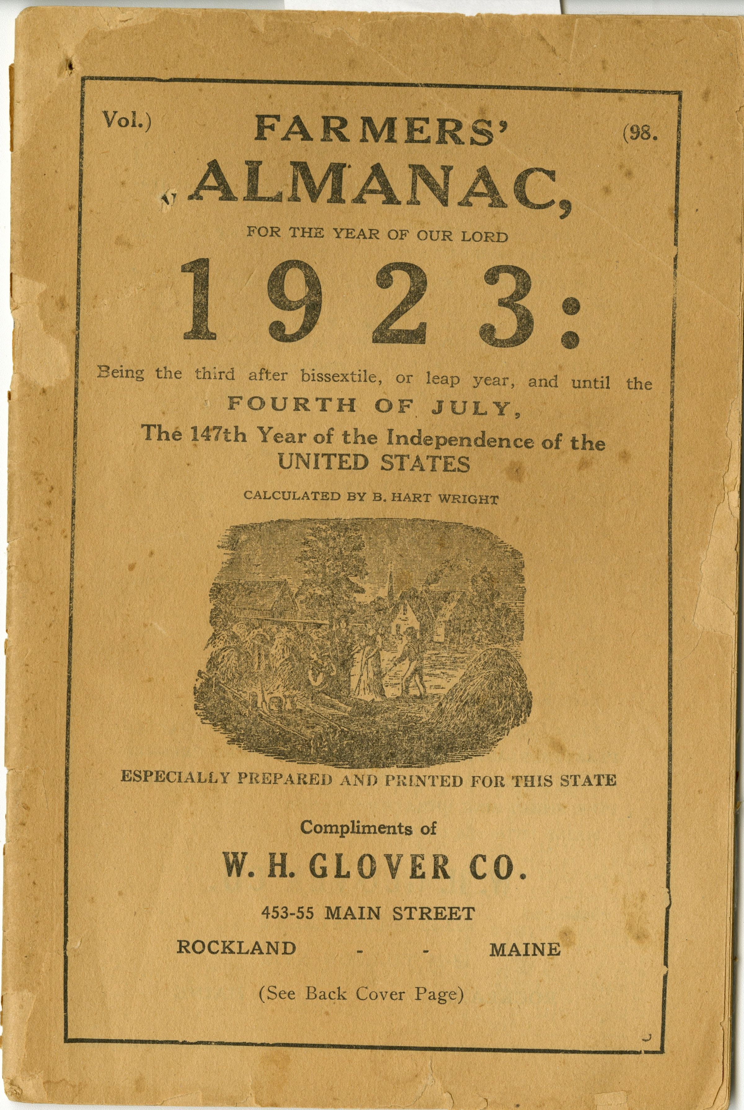 Booklet, "Farmers' Almanac for the year or our Lord 1923" compliments of W.H. Glover Co. Vol. 98.