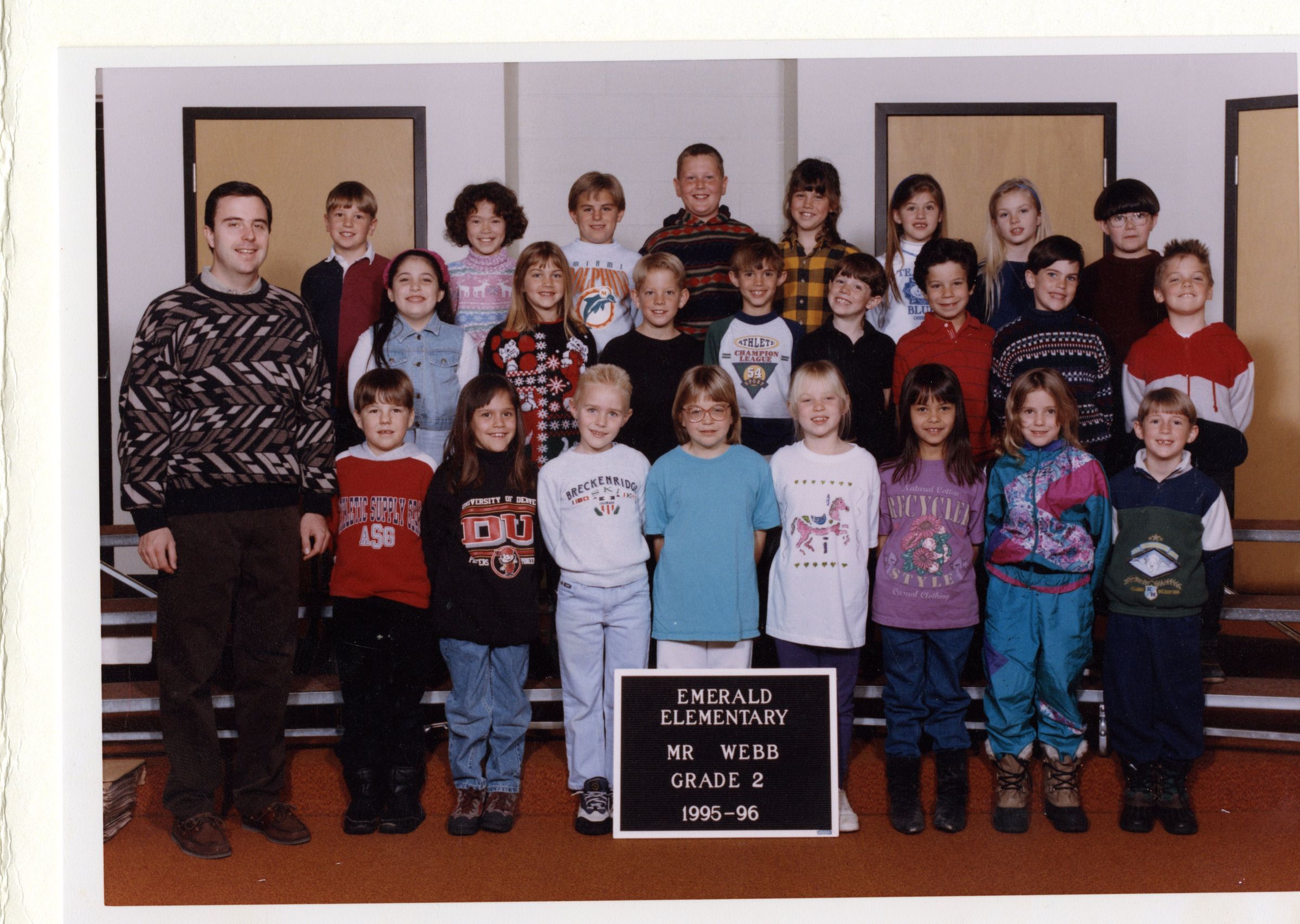 Photo of Mr. Webb's second grade class at Emerald Elementary in 1995-1996. There are three rows of students, and Mr. Webb stands to the students' right. The plaque that sits in front of the first row students' feet reads "Emerald Elementary, Mr. Webb, Grade 2, 1995-96". The photo is tucked inside a cream-colored paper.Collection
