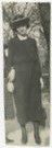 Black and white photograph of a woman standing on a sidewalk. The woman is wearing a black dress, tights, black shoes, and a hat. There are leafless trees visible as well as several buildings in the background. On the left edge of the photograph is another woman. All that is visible of this second person is a hand, plaid skirt, and one black shoe.Lexicon