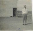 Black and white photograph of a man is business attire standing in an empty yard. The man is identified as Les. It is probably Lester C. Brunner.