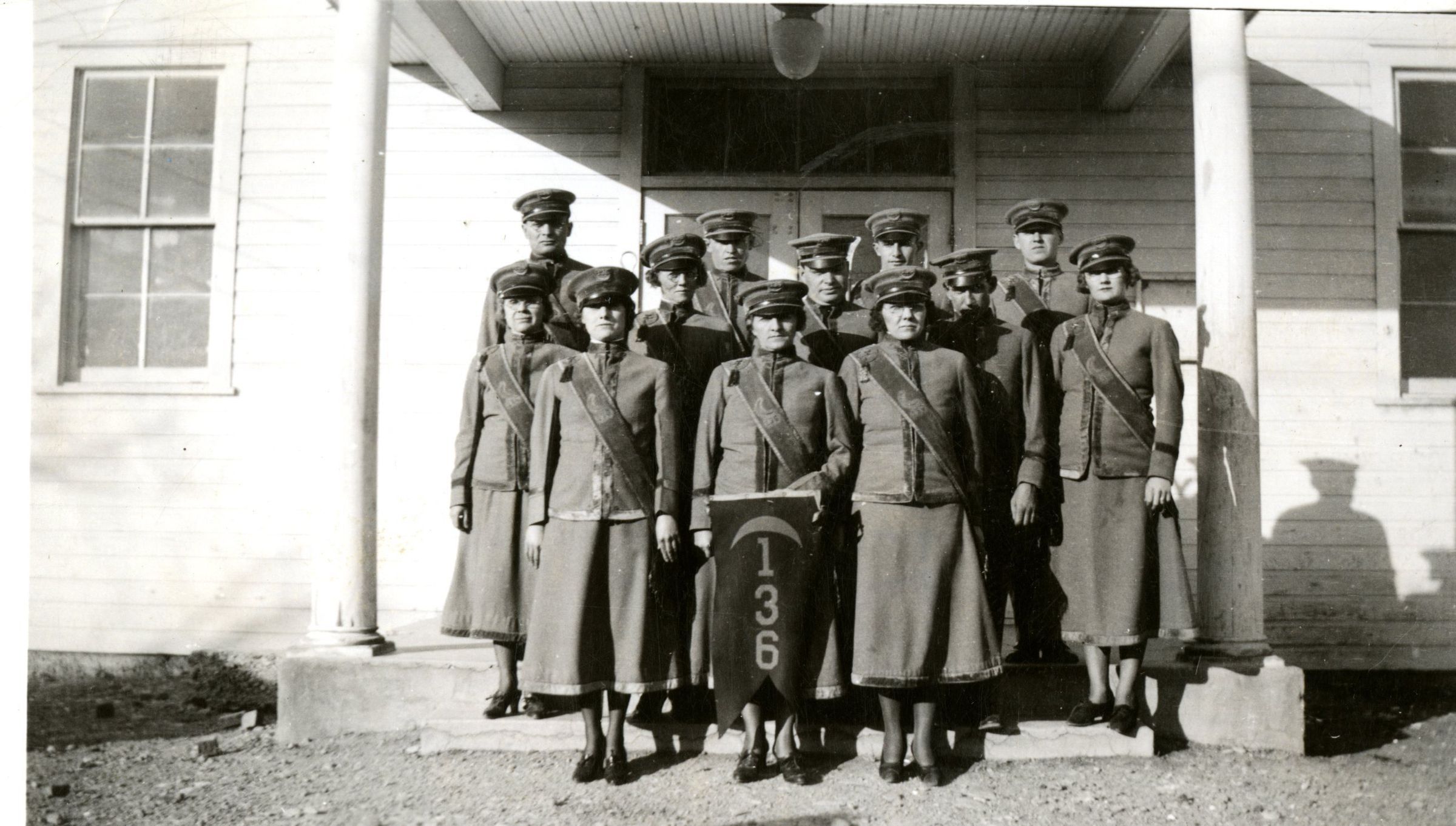 Crescent Grange Drill Team 1935. Thirteen people stand in uniform on the steps of the Broomfield Grange. Individuals not identified, but Miles Crawford standing in back center.