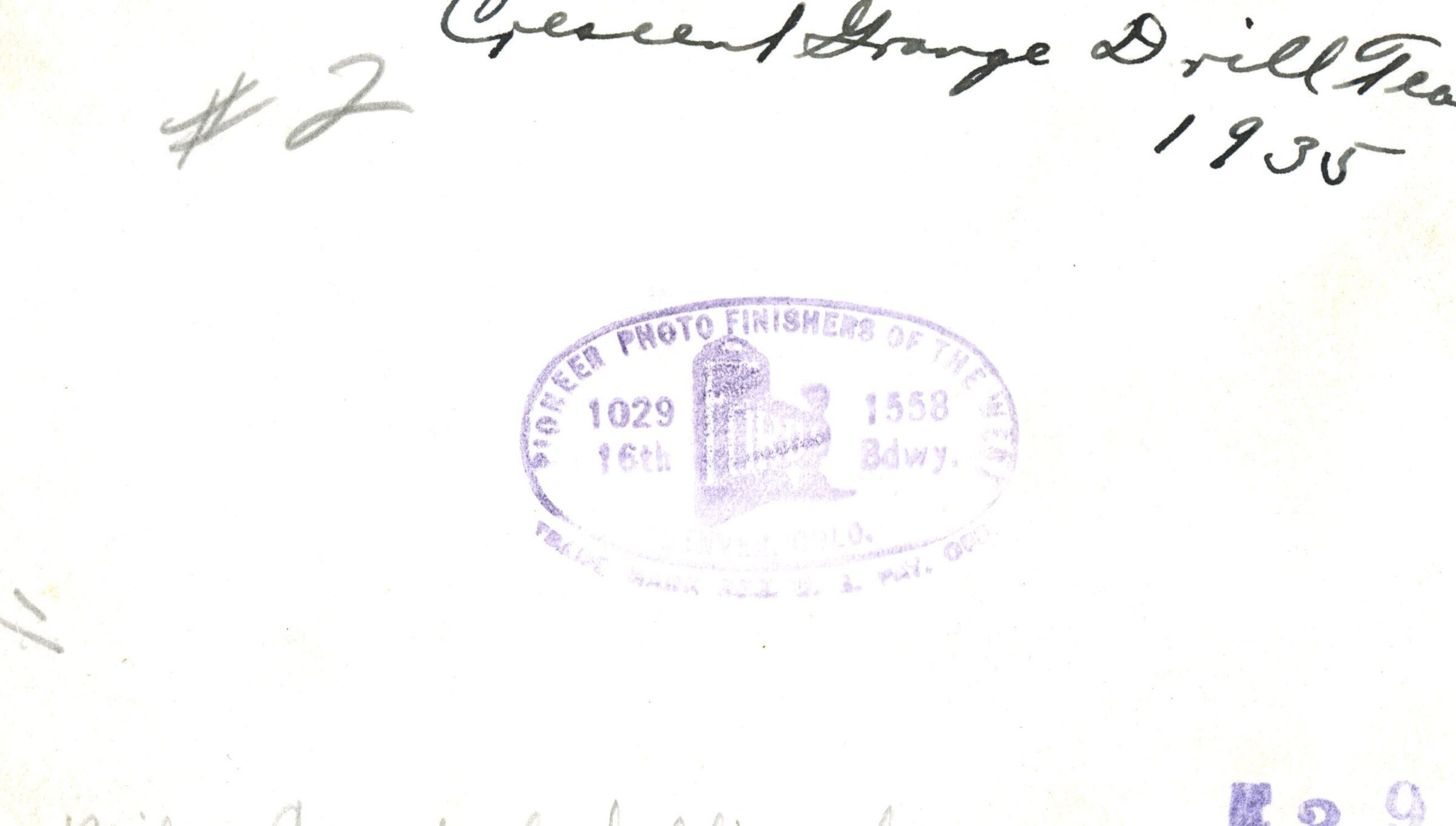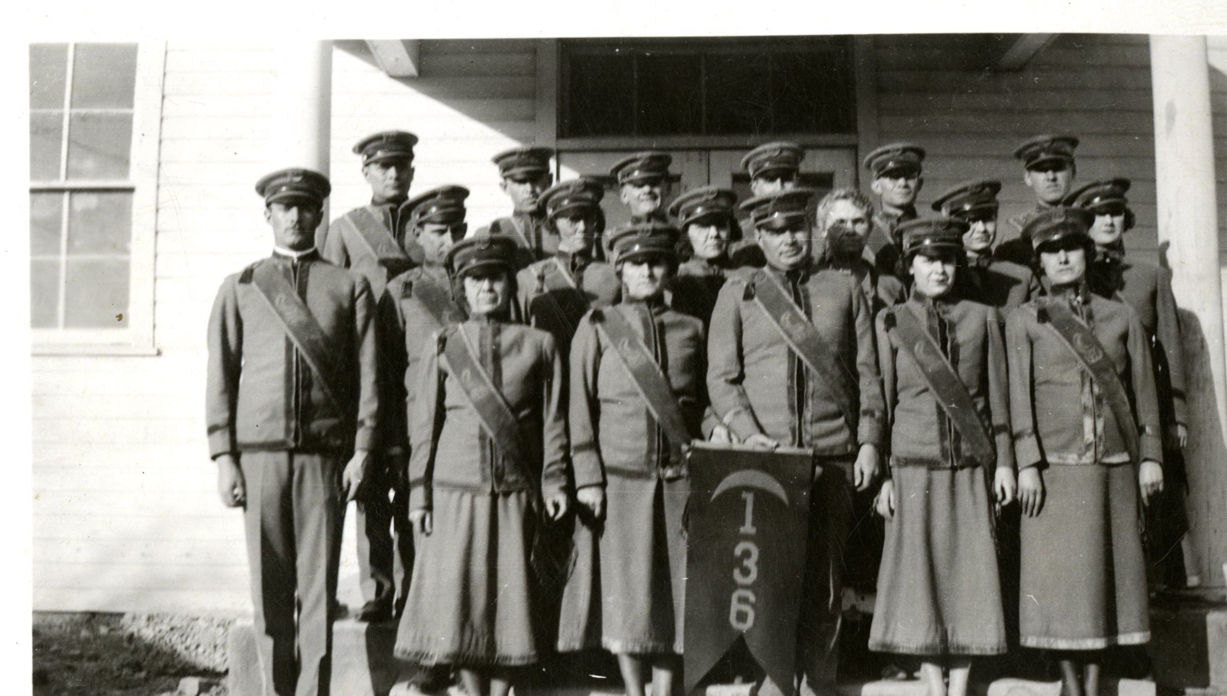 Crescent Grange Drill Team standing outside in front of the Broomfield Crescent Grange, 1935. Individual unidentified except Miles Crawford, who hold the banner.