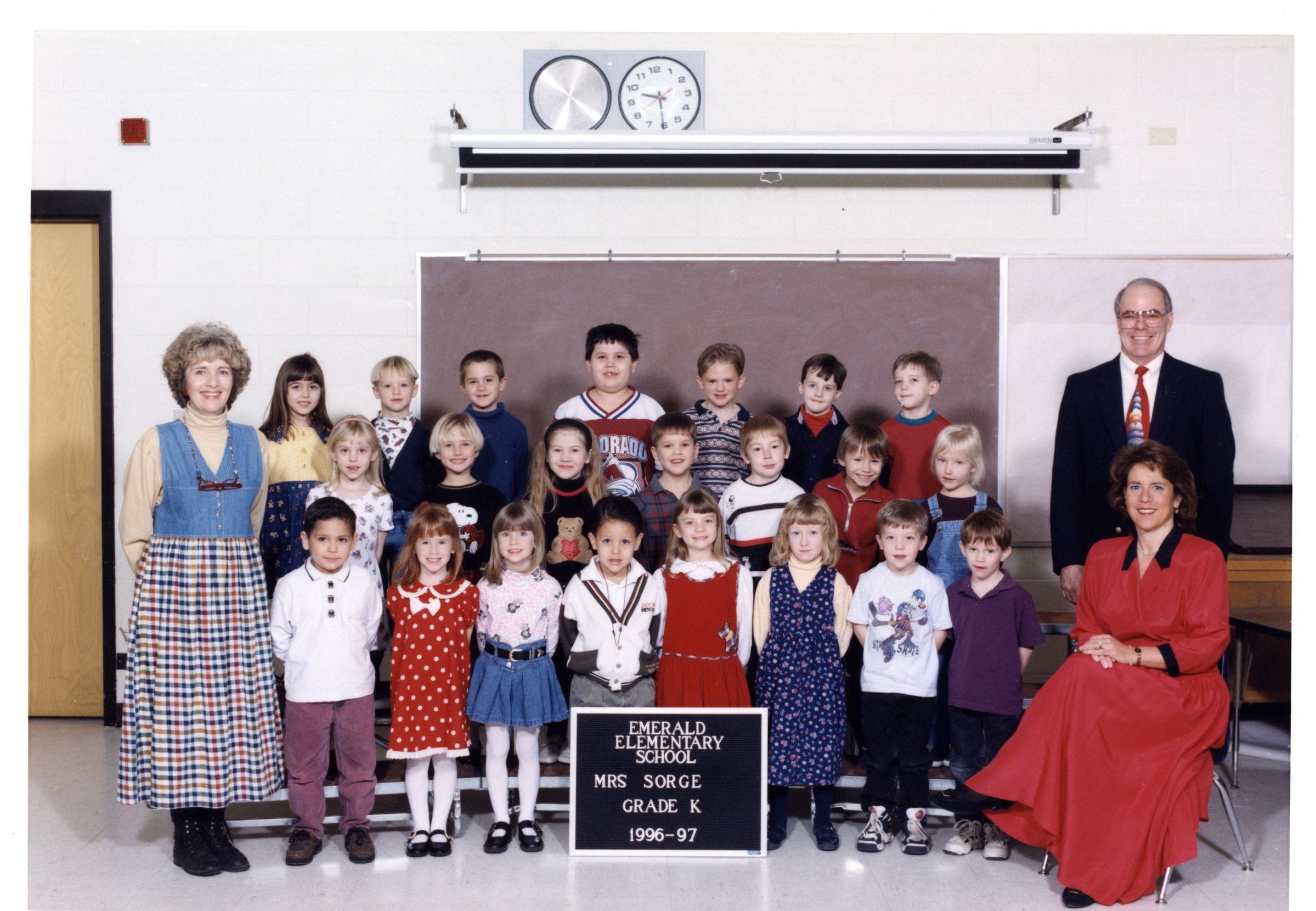 Inside color class photo of Mrs. Sorge, Grade K, 1996-1997 with three rows of students and three teachers. Back page black and white picture of Emerald Elementary Staff 1996-1997, four rows. Front cover black and white picture of Emerald Elementary School.