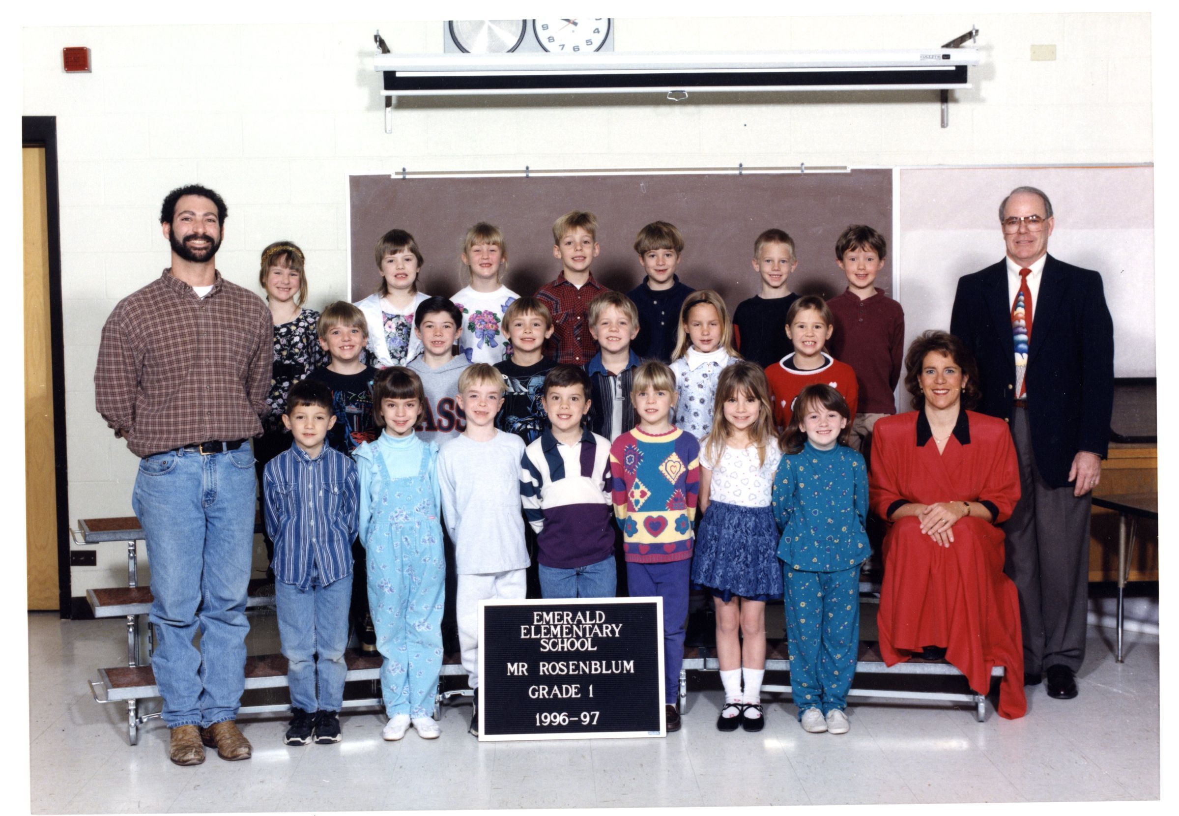 Front cover black and white photo of Emerald Elementary. Inside color class photo of Emerald Elementary School, Mr. Rosenblum, Grade 1, 1996-1997. Three rows of students and three teachers. Back cover black and white photo of Emerald Elementary Staff 1996-1997, four rows of teachers.Lexicon