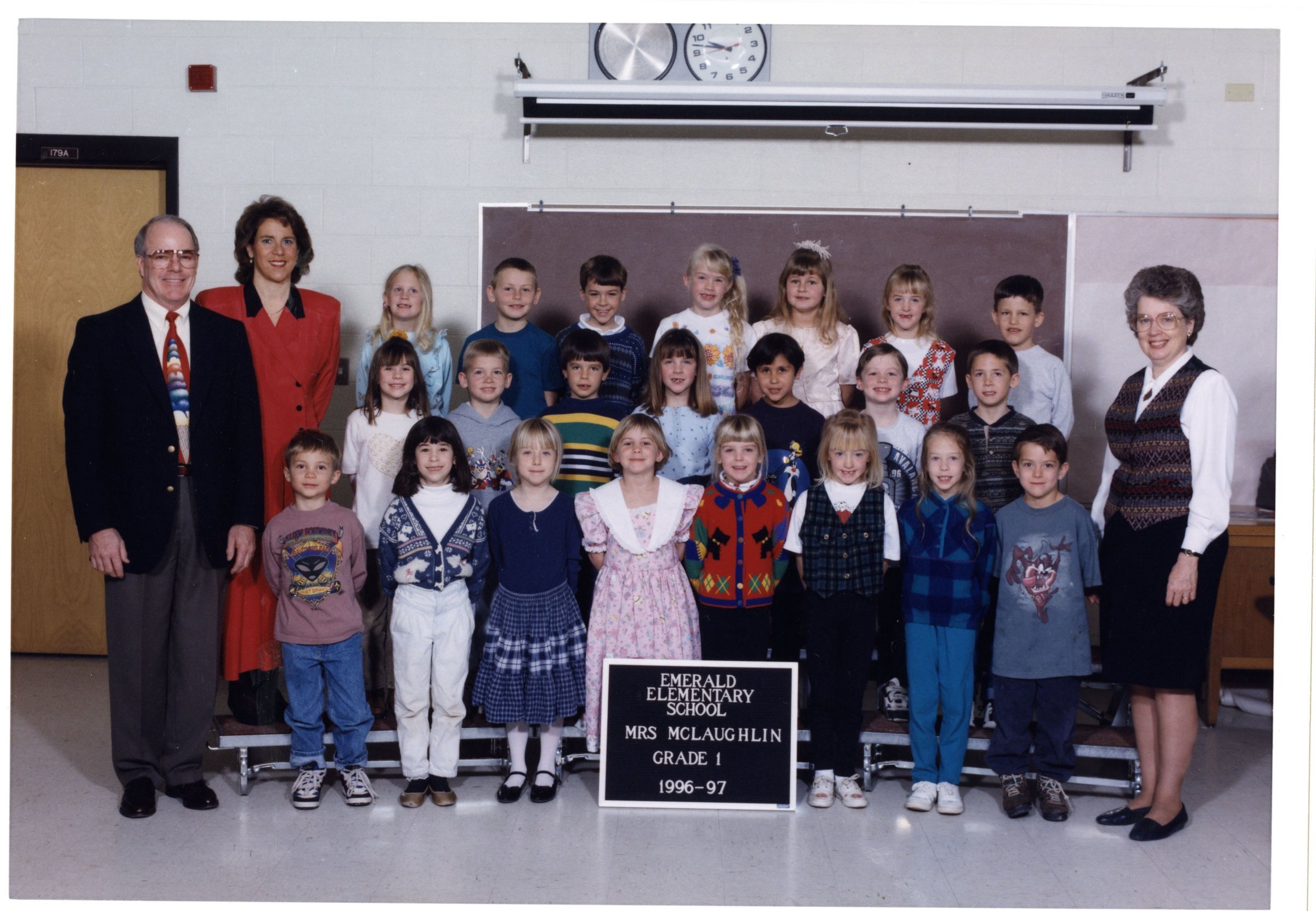 Front cover black and white photo of Emerald Elementary 1996-1997. Inside color class photo of Emerald Elementary School, Mrs. McLaughlin, Grade 1, 1996-1997, three rows of students, three teachers. Back cover, black and white photo of Emerald Elementary Staff, 1996-1997, four rows of teachers.Lexicon