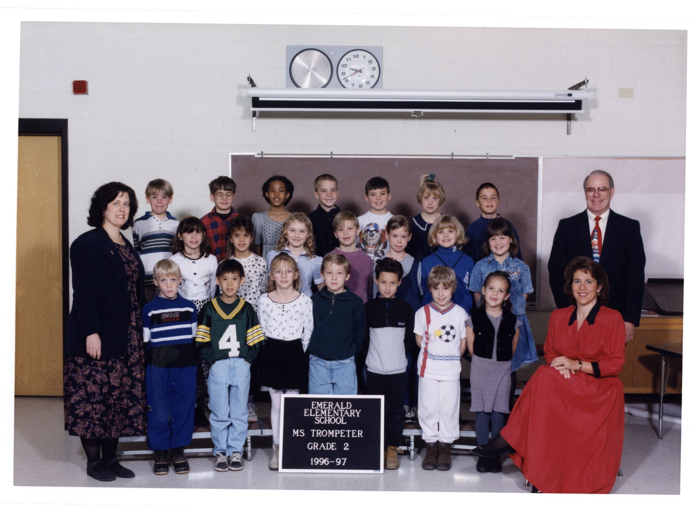 Front cover black and white photo of Emerald Elementary, 1996-1997. Inside color class photo of Emerald Elementary School, Ms. Trompeter, Grade 2, 1996-1997, three row of students, three teachers. Back cover, black and white photo of Emerald Elementary Staff, 1996-1997, four rows of teachers.Lexicon