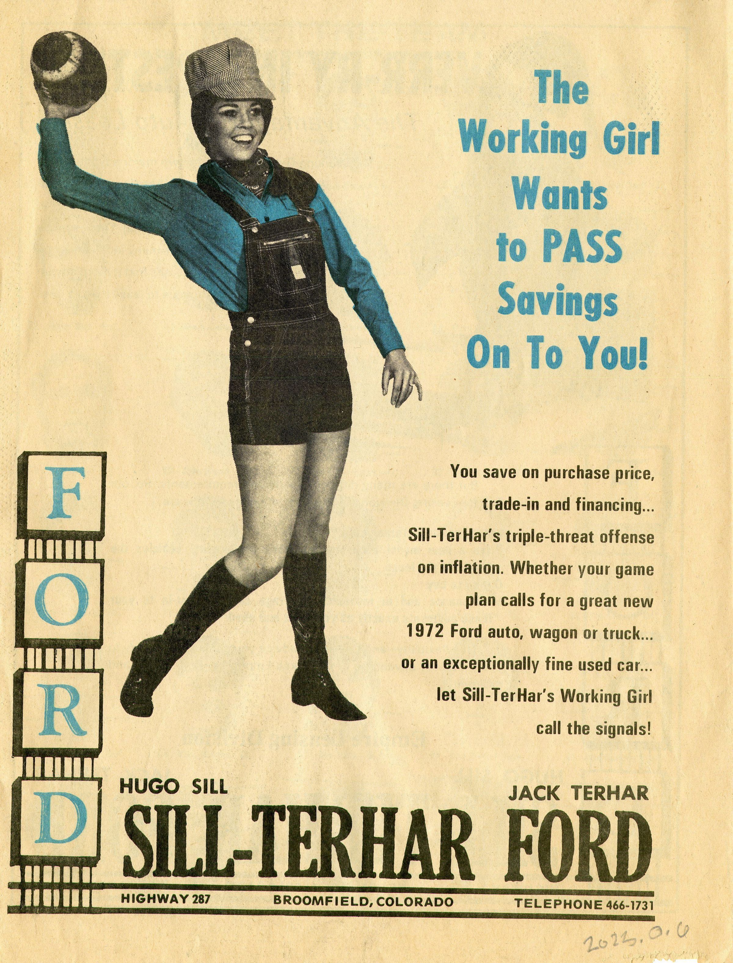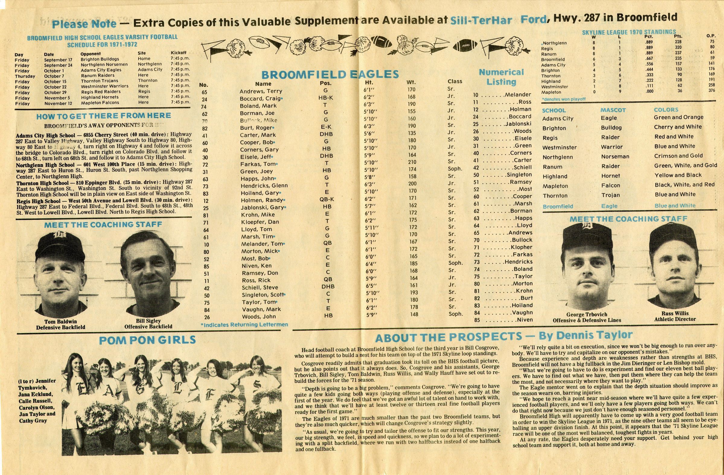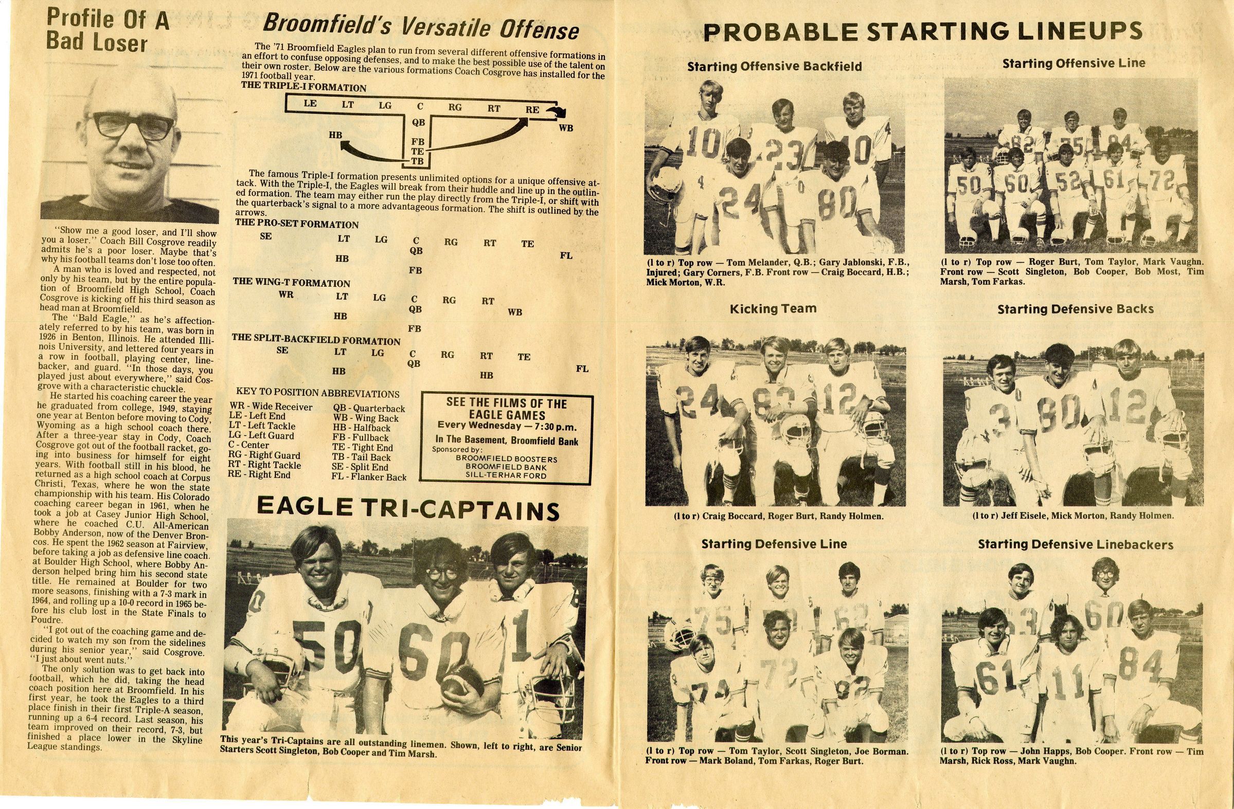 6 light brown pages 8inx11in magazine about the Broomfield High School football team of 1971. Front cover have black and blue ink of a man in a baseball cap and glasses in a box around him with 6 cheerleading girls under in a triangular formation. The first 2 inside pages have different football formations, an article about being a bad loser and images of the football captains and different people in different lineups. The 3rd and 4th page have names of different players, coaches and cheerleaders on the team. As well as their schedule and other information about other high school football teams. The 5th page has headshots of the players. The 6th page and backside has an advertisements for car leases using female models .