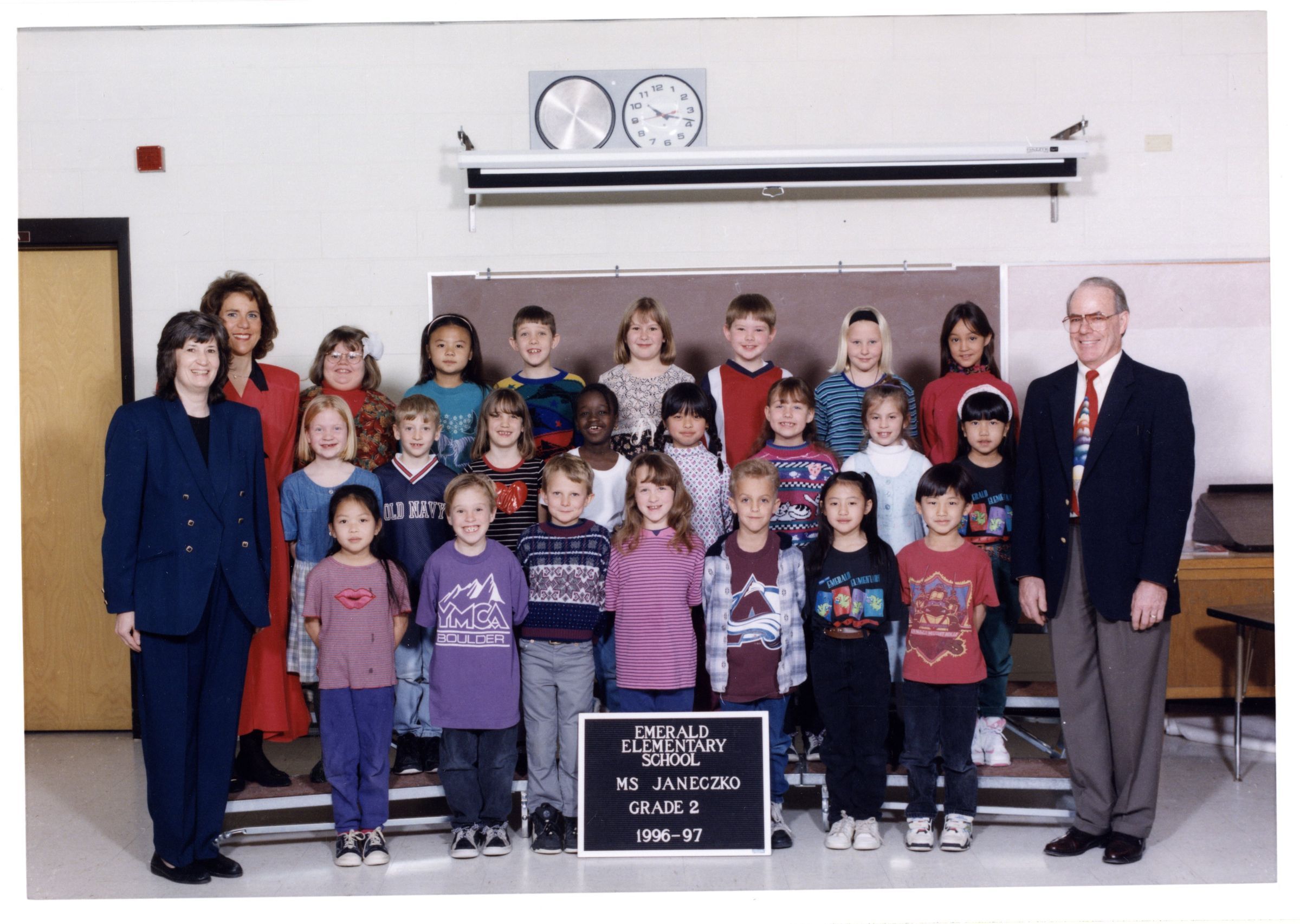 Front cover, black and white photo of Emerald Elementary 1996-1997. Inside color class photo of Emerald Elementary School, Ms. Janeczko, Grade 2, 1996-1997, three rows of students, three teachers. Back cover black and white photo of Emerald Elementary Staff, 1996-1997, four rows of teachers.Lexicon