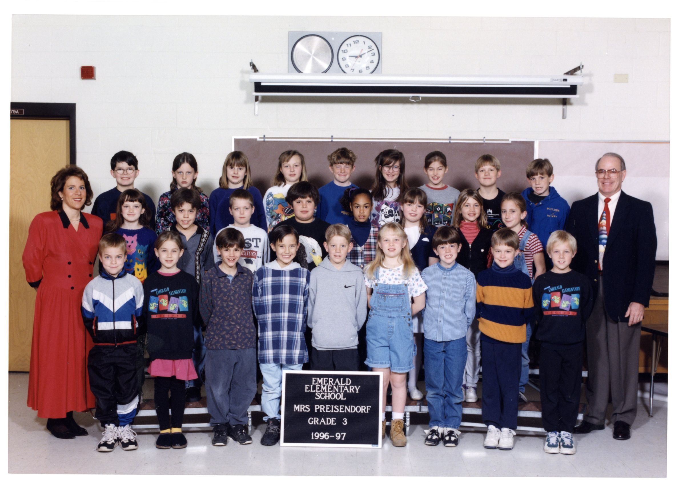 Front cover black and white photo of Emerald Elementary. Inside color class photo of Emerald Elementary School, Mrs. Preisendorf, Grade 3, 1996-1997, three rows of students, two teachers. Back cover, black and white photo of Emerald Elementary Staff, 1996-1997, four rows of teachers.Lexicon