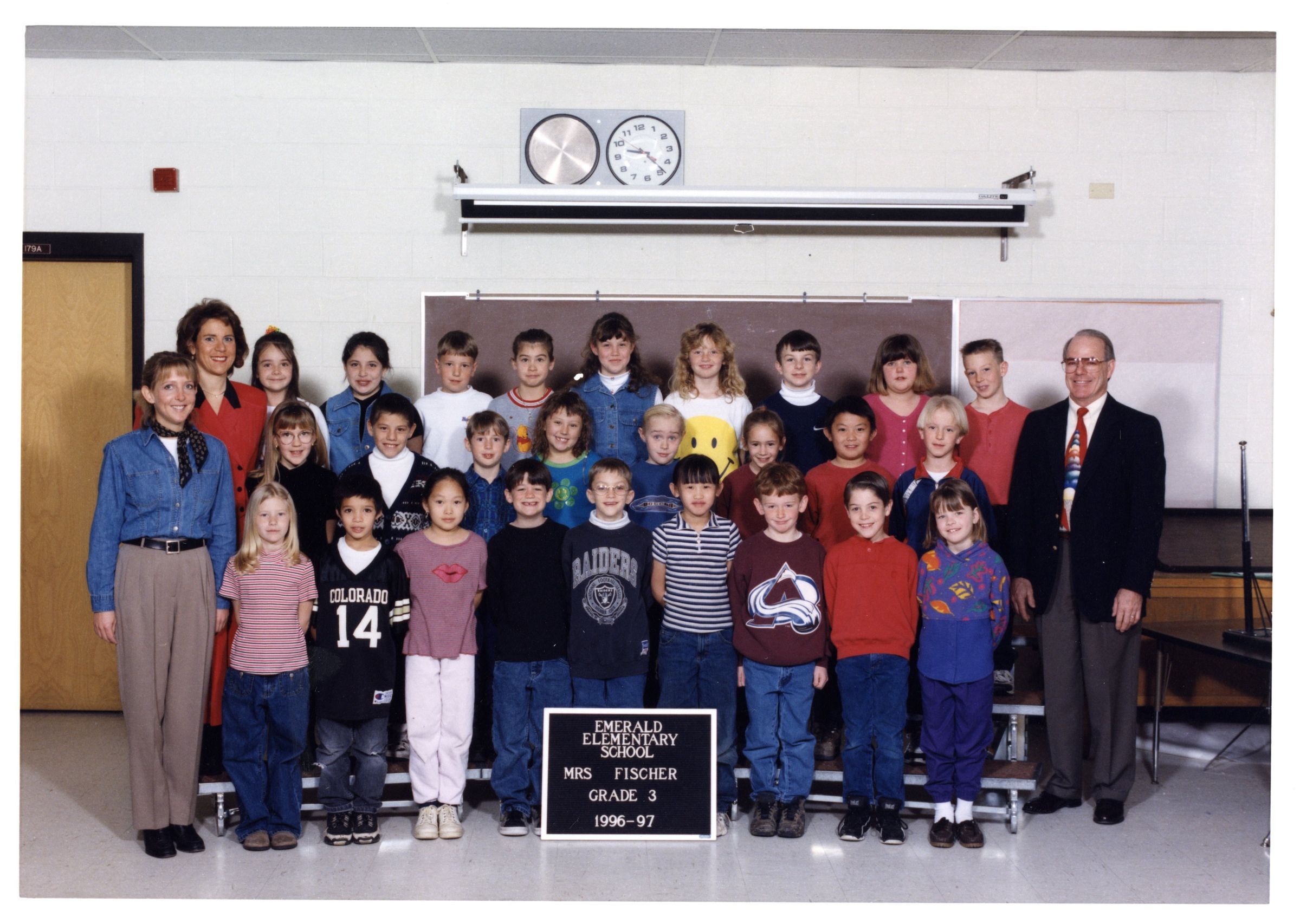 Front cover, black and white photo of Emerald Elementary, 1996-1997. Inside color class photo of Emerald Elementary School, Mrs. Fischer, Grade 3, 1996-1997, three rows of students, three teachers. Back cover, black and white photo of Emerald Elementary Staff, 1996-1997, four rows of teachers.Lexicon