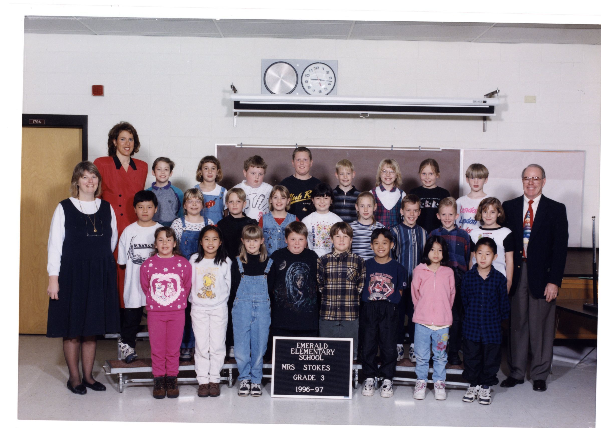 Front cover black and white photo of Emerald Elementary. Inside color class photo of Emerald Elementary School, Mrs. Stokes, Grade 3, 1996-1997, three rows of students, three teachers. Back cover black and white photo of Emerald Elementary Staff, 1996-1997, four rows of teachers.Lexicon