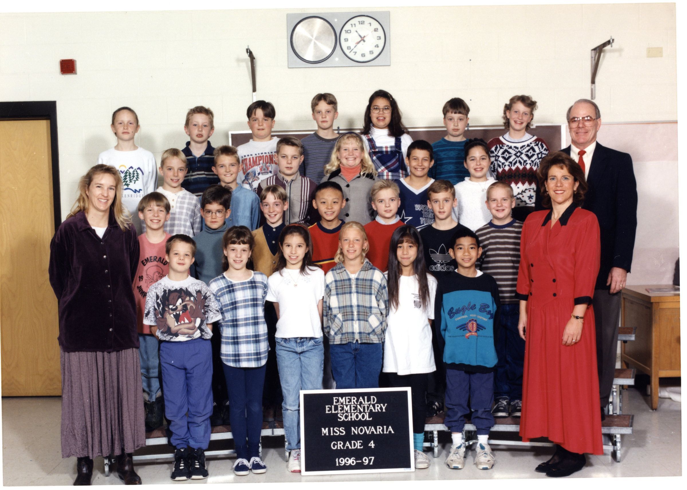 Front cover black and white photo of Emerald Elementary School. Inside color class photo of Emerald Elementary Shool, Miss Novaria, Grade 4, 1996-1997, four rows of students, three teachers. Back cover black and white photo of Emerald Elementary Staff, 1996-1997, four rows of teachers.Lexicon