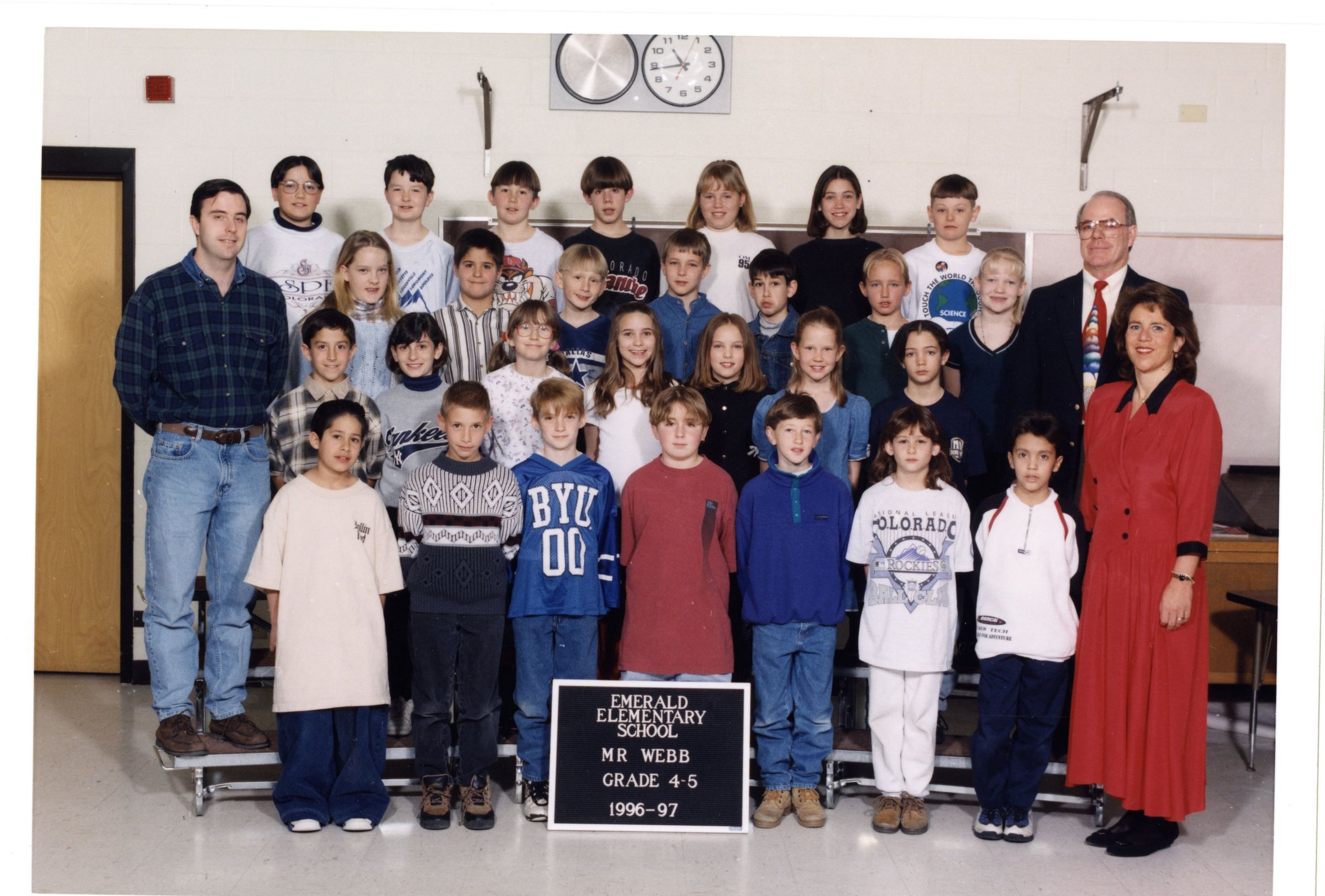 Front cover black and white photo of Emerald Elementary School. Inside color class photo of Emerald Elementary School, Mr. Webb, Grade 4-5, 1996-1997, four rows of students, three teachers. Back cover black and white photo of Emerald Elementary Staff 1996-1997, four rows of teachers.Lexicon
