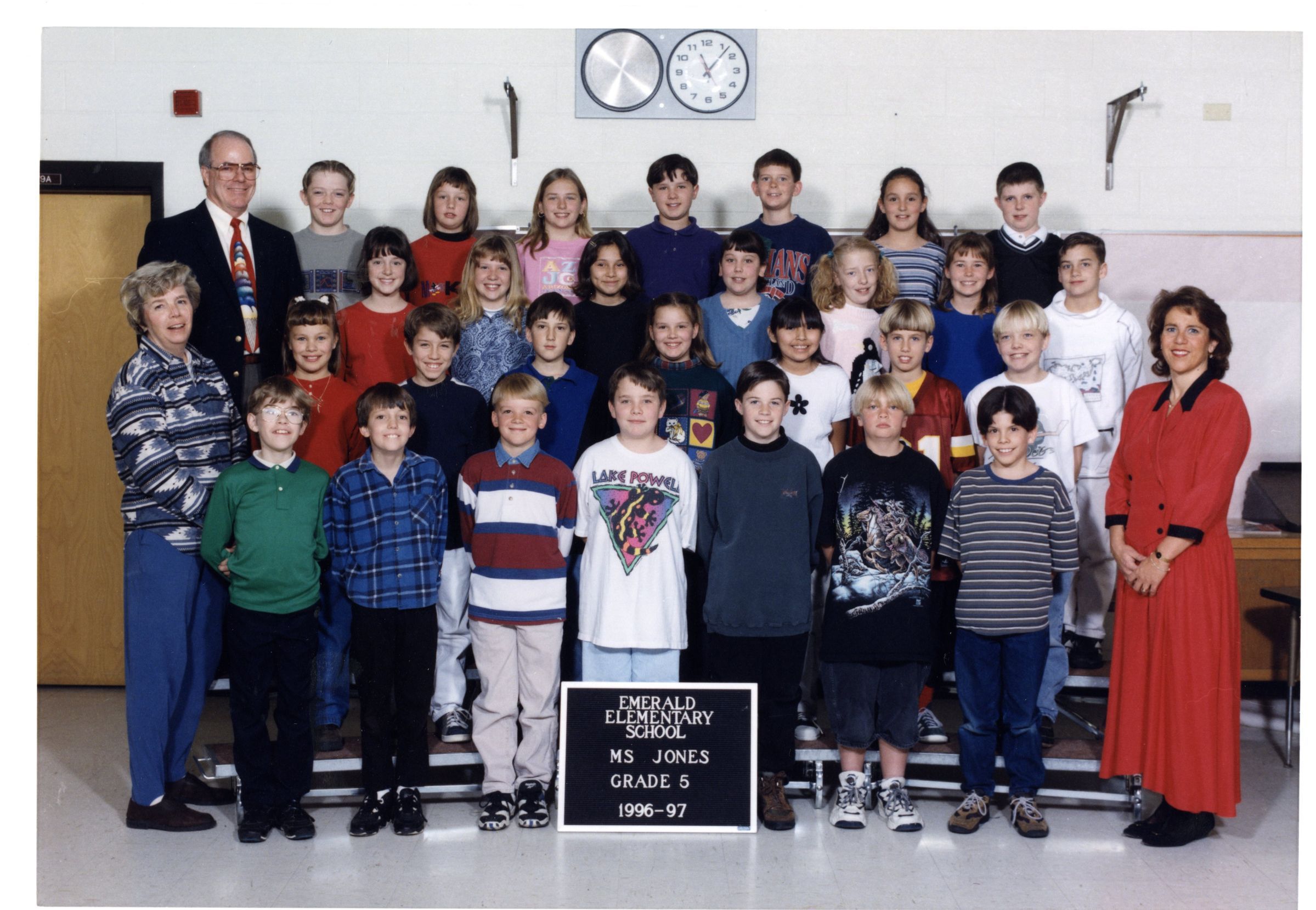 Front cover black and white photo of Emerald Elementary School. Inside color class photo of Emerald Elementary School, Ms. Jones, Grade 5, 1996-1997, four rows of students, three teachers. Back cover black and white photo of Emerald Elementary Staff, 1996-1997, four rows of teachers.Lexicon