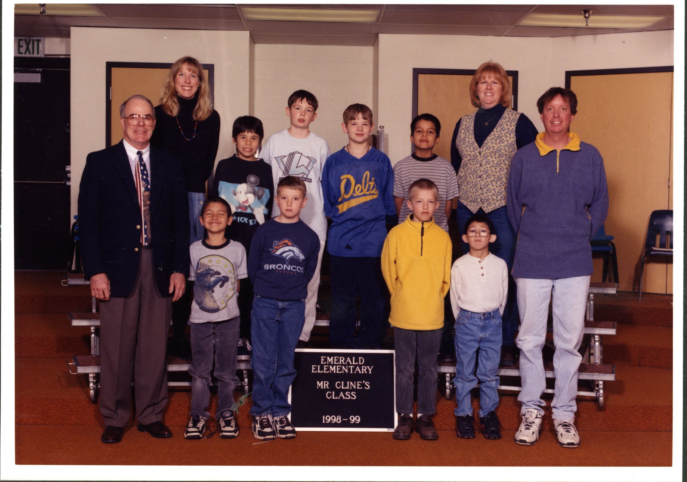 Color class photo of Emerald Elementary, Mr. Cline's Class, 1998-1999. No grade listed.