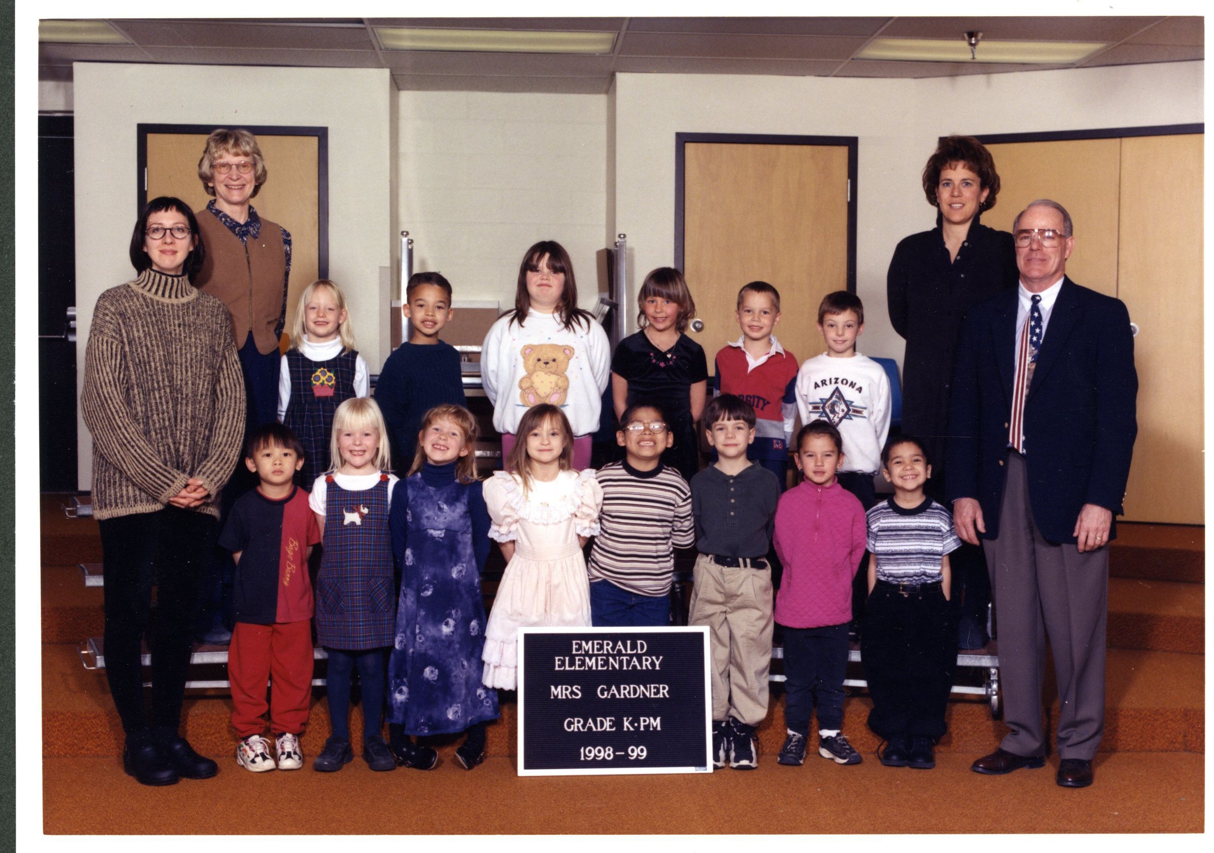 Color class photo Emerald Elementary Mrs. Gardner, Grade K-PM, 1998-99, two rows of students, four teachers.
