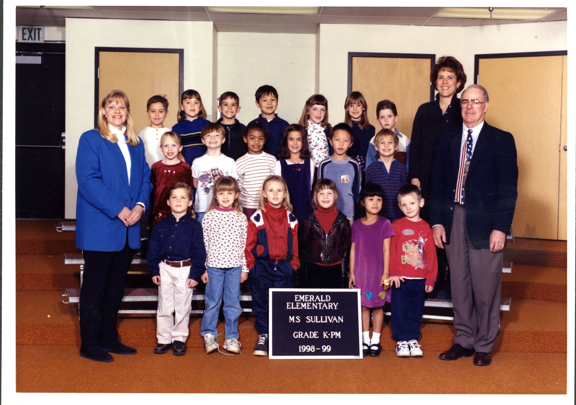 Color class photo of Emerald Elementary, Ms. Sullivan, Grade K-PM, 1998-99, three rows of students, three instructors.