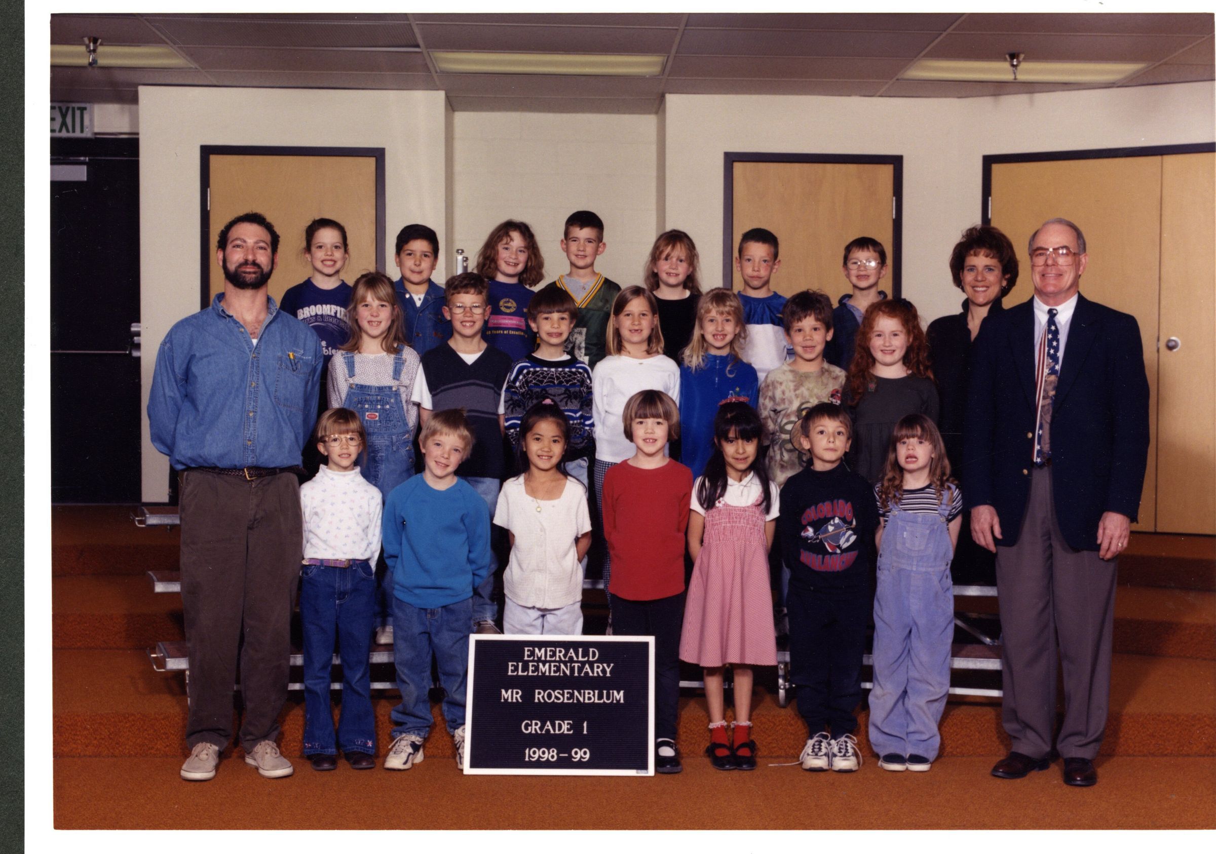 Color class photo of Emerald Elementary Mr. Rosenblum, Grade 1, 1998-99. three rows of students, three teachers.