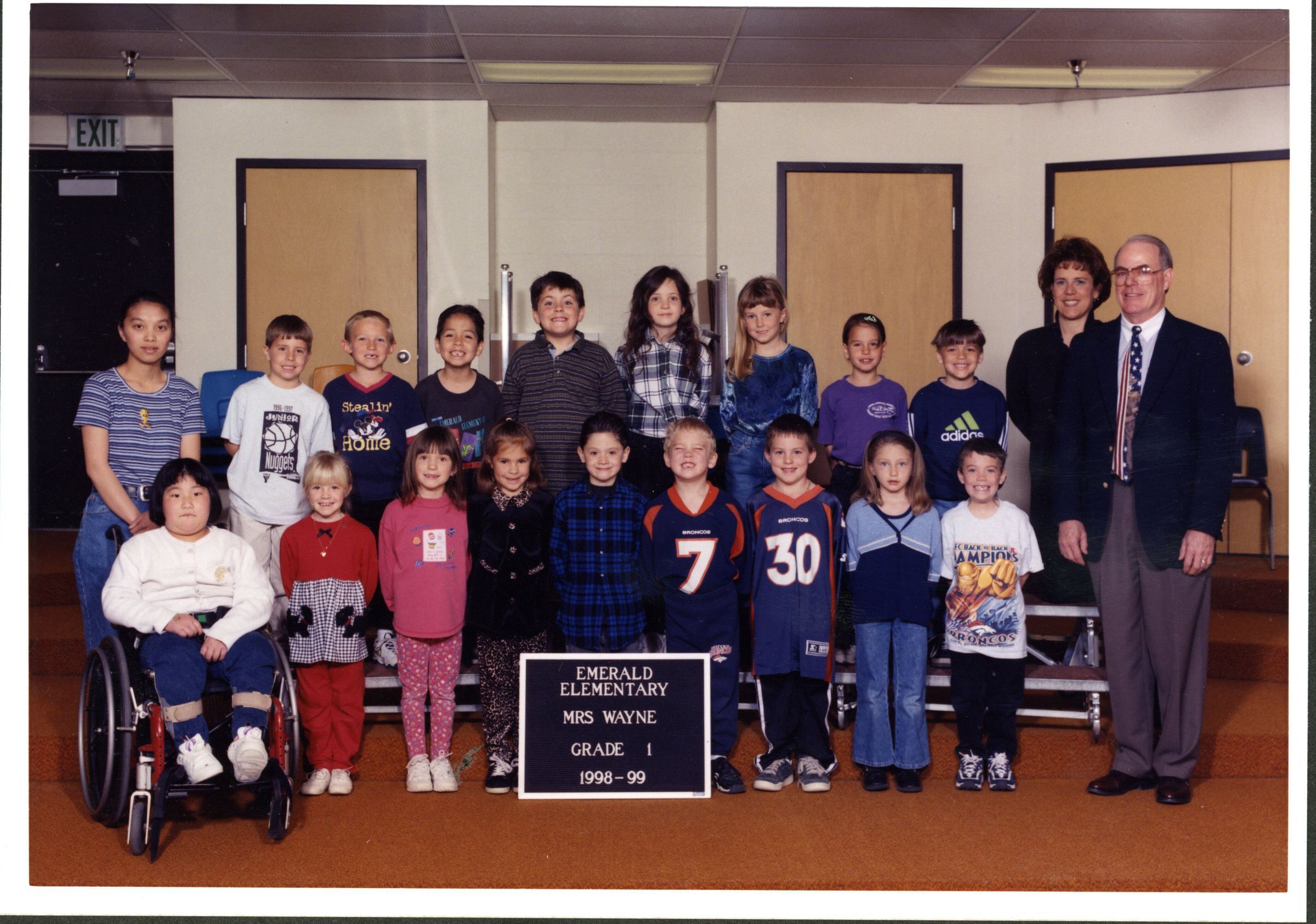 Color class photo of Emerald Elementary Mrs. Wayne, Grade 1, 1998-99, two rows of students, one handicapped, three teachers.