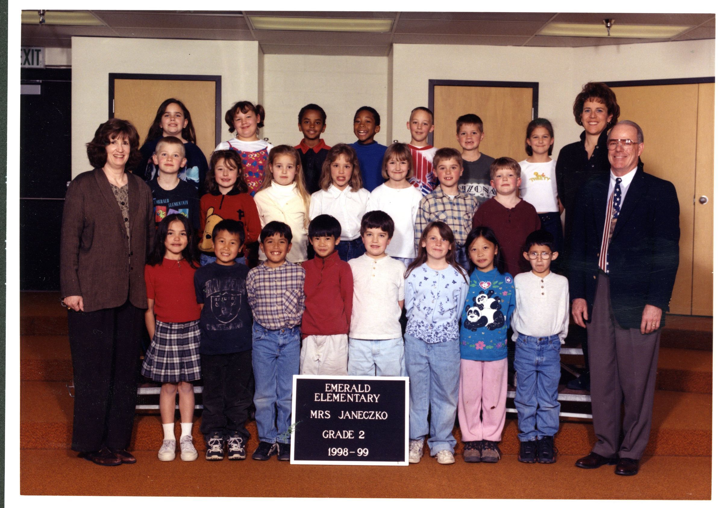 Color class photo of Emerald Elementary Mrs. Janeczko, Grade 2, 1998-99, three rows of students, three teachers,