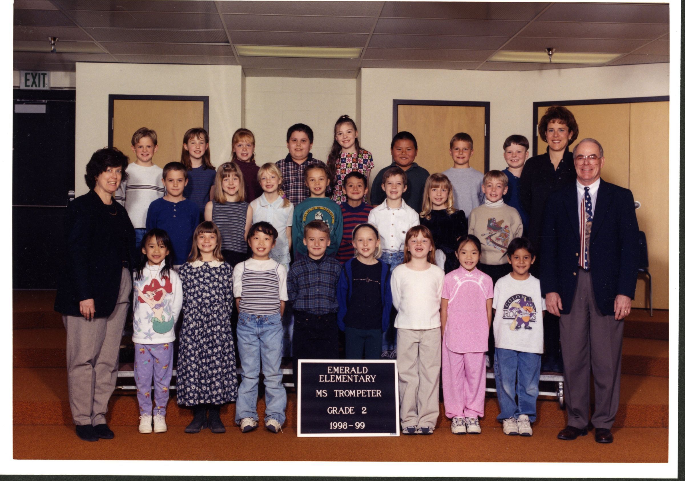 Color class photo of Emerald Elementary Ms. Trompeter, Grade 2, 1998-99, three rows of students, three teachers.
