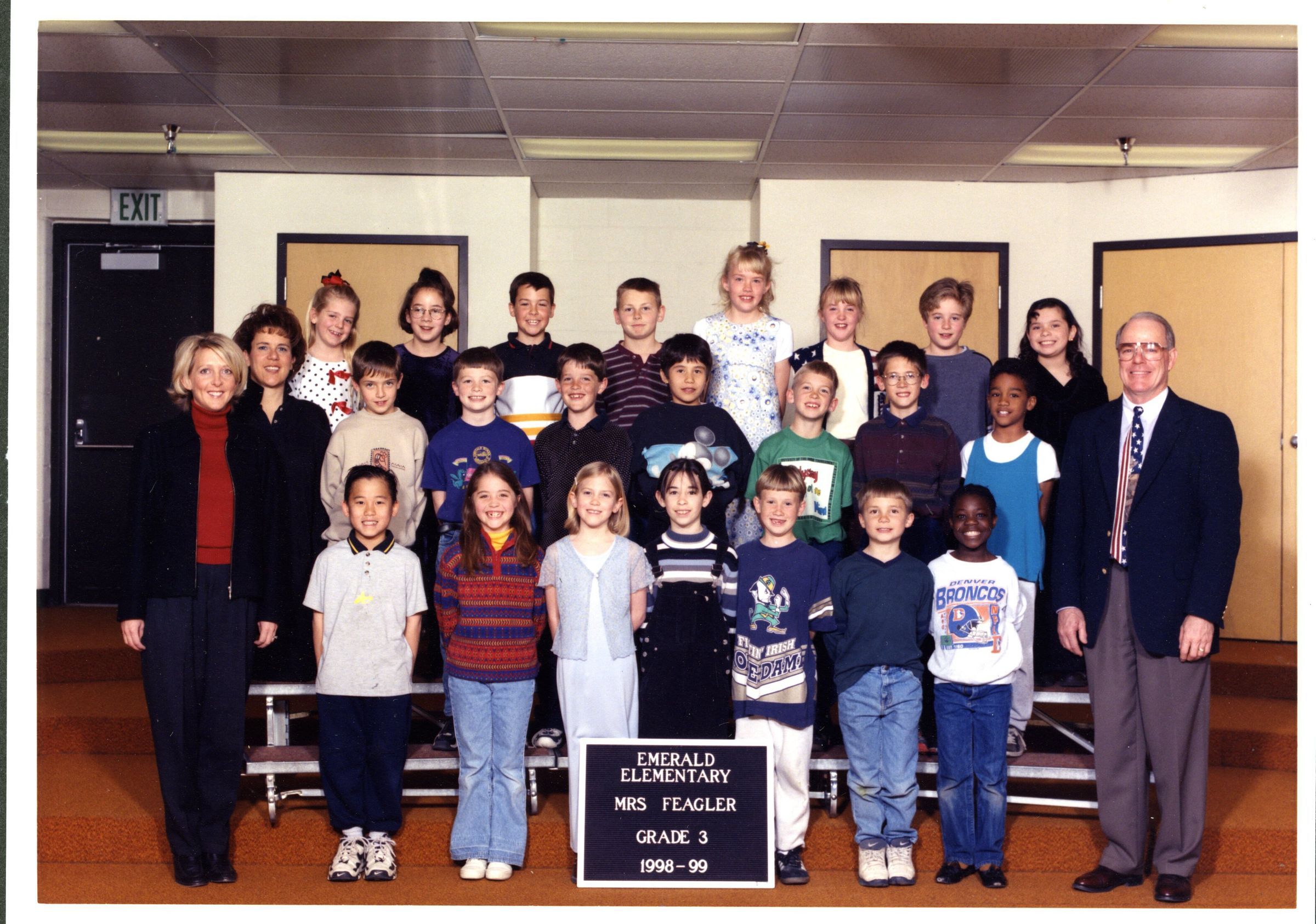 Color class photo of Emerald Elementary Mrs. Feagler, Grade 3, 1998-99, three rows of students, two teachers.