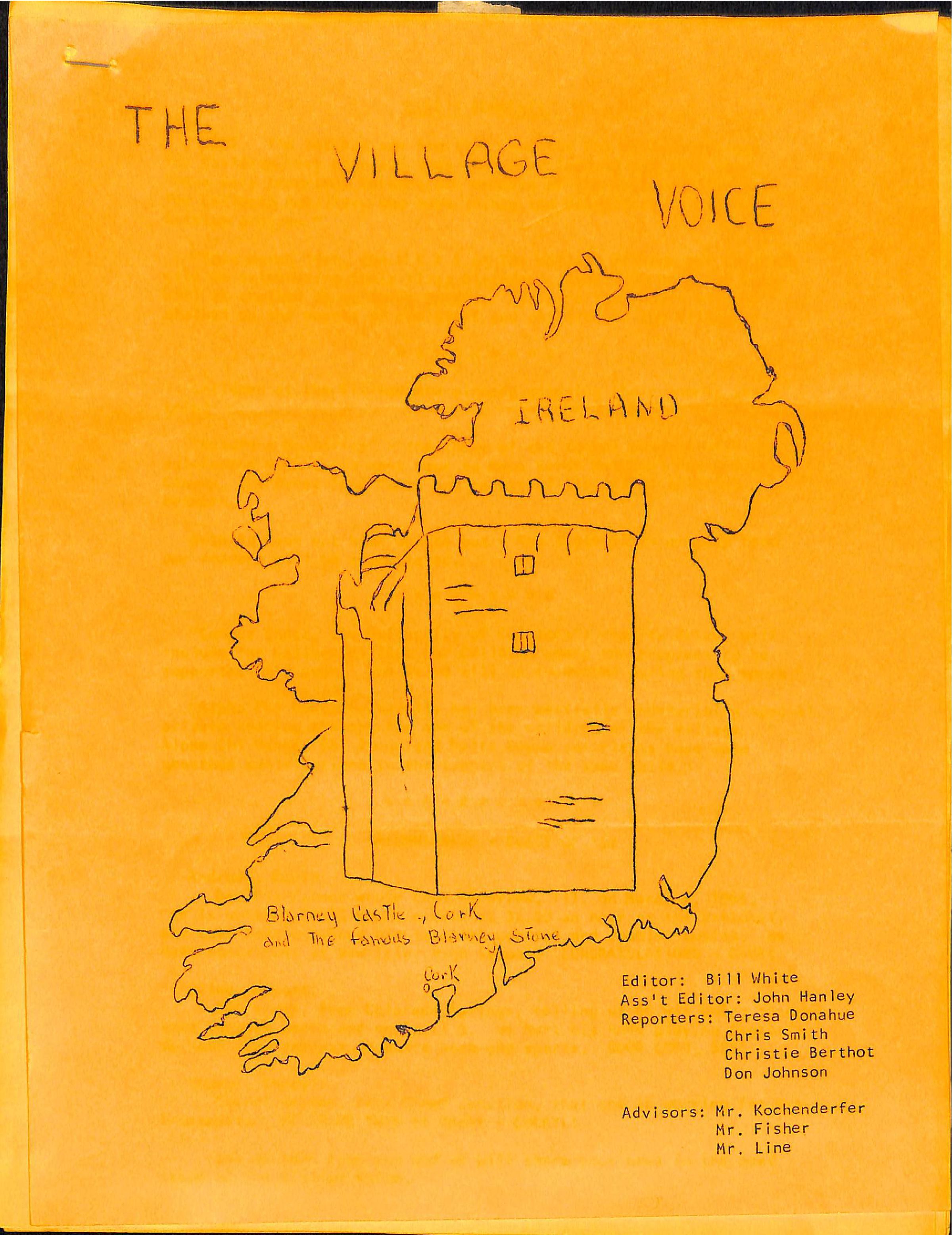 Item is an orange packet titled, "The Village Voice." On the front page, there is an image of Ireland and a castle below the title, along with the names of the editors, advisors, and reporters for the packet. On the next page, there is a section on alumni news and comments from Cleo Spurlock Wallace, the founder of the Wallace Village for Children, for which the packet was published. The next few pages contain an editorial and a note from the school's therapist, explaining how important it is for children to have time to play. The packet also tells about how the children are learning about different countries of the world. Two accounts of the story of St. Patrick are included, which is probably why Ireland is on the front cover of the packet. The rest of the newsletter features literary works from children that attended the Wallace Village for Children. On the back of the packet, the Village's P.O. Box and postage information is printed. The Wallace Village for Children (previously the Wallace School) was established in 1948 by Cleo Wallace. It was founded as a school for children with brain injuries. Before the school, Wallace had gotten her Master's Degree in speech pathology at the University of Denver and would provide therapy for kids from her home. The Wallace Village was located in Broomfield.Collection