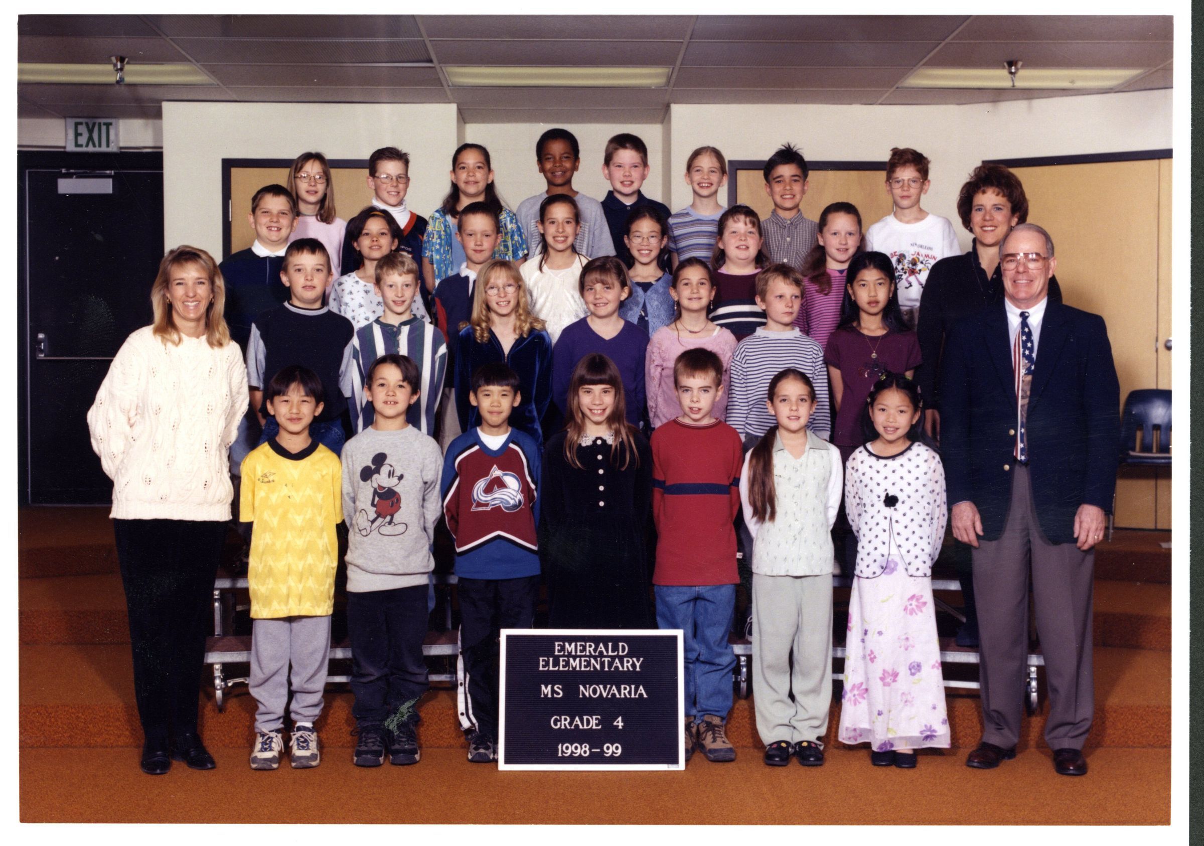 Color class photo of Emerald Elementary Ms. Novaria, Grade 4, 1998-99, three rows of students, three teachers.
