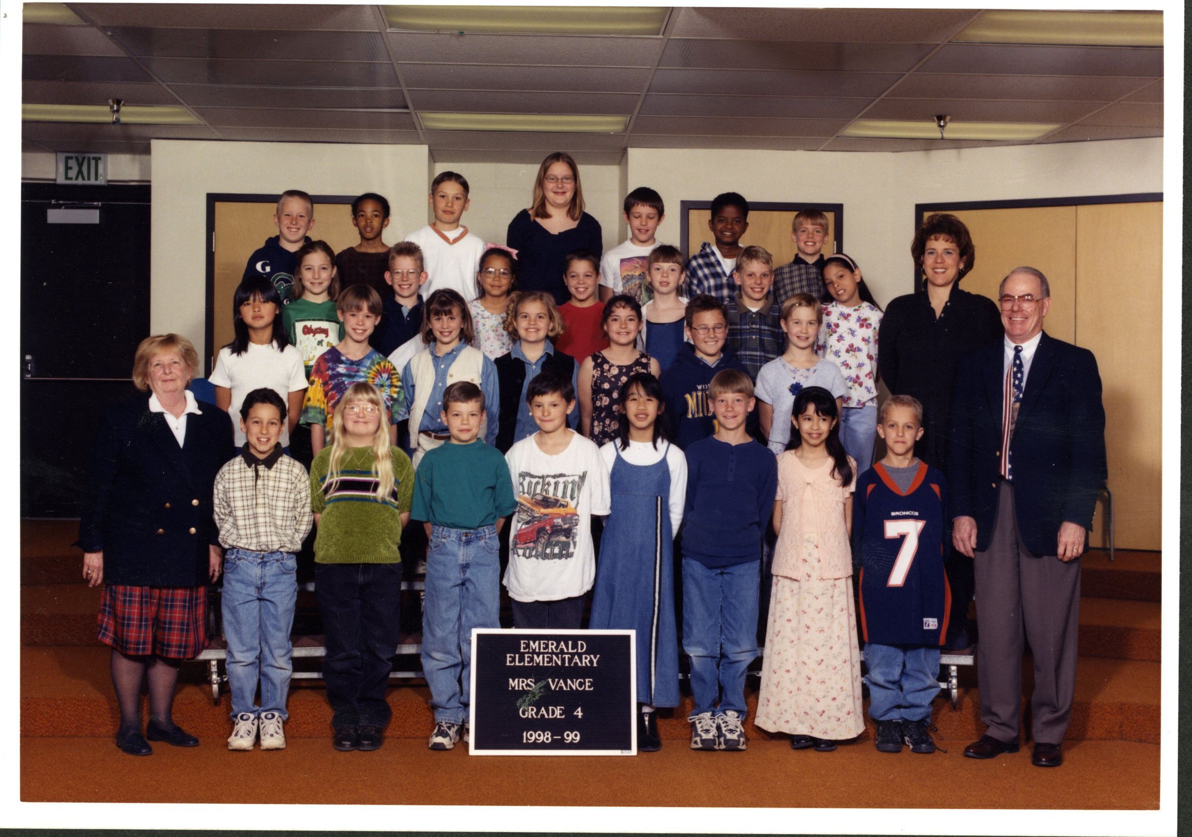Color class photo of Emerald Elementary Mrs. Vance, Grade 4, 1998-99, four rows of students, three teachers.