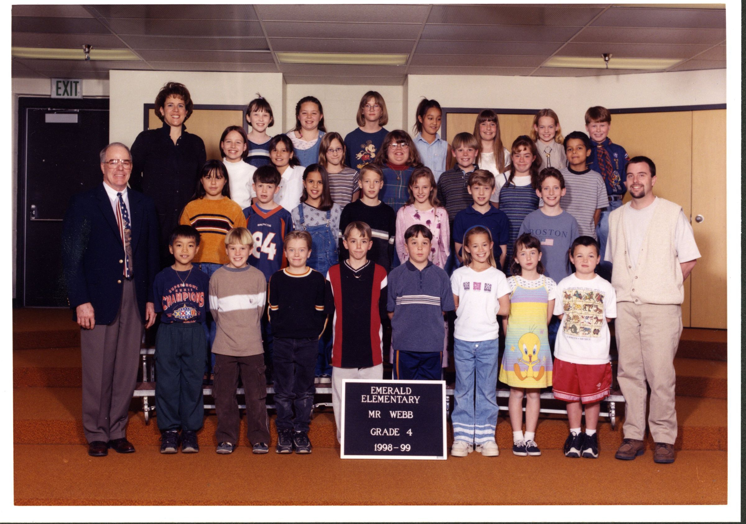 Color class photo of Emerald Elementary Mr.Webb, Grade 4, 1998-99, four rows of students, three teachers.
