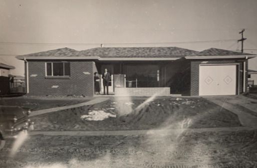 Home of Duane Wiley at 106 Hemlock Street, Broomfield Heights. Circa late 1950's. The Wiley's purchased their home in 1956. Notice dirt yard and dirt road (reflection in picture is part of picture). John and Verna Atkinson lived across street as well as Tom and Peg Reed.Collection
