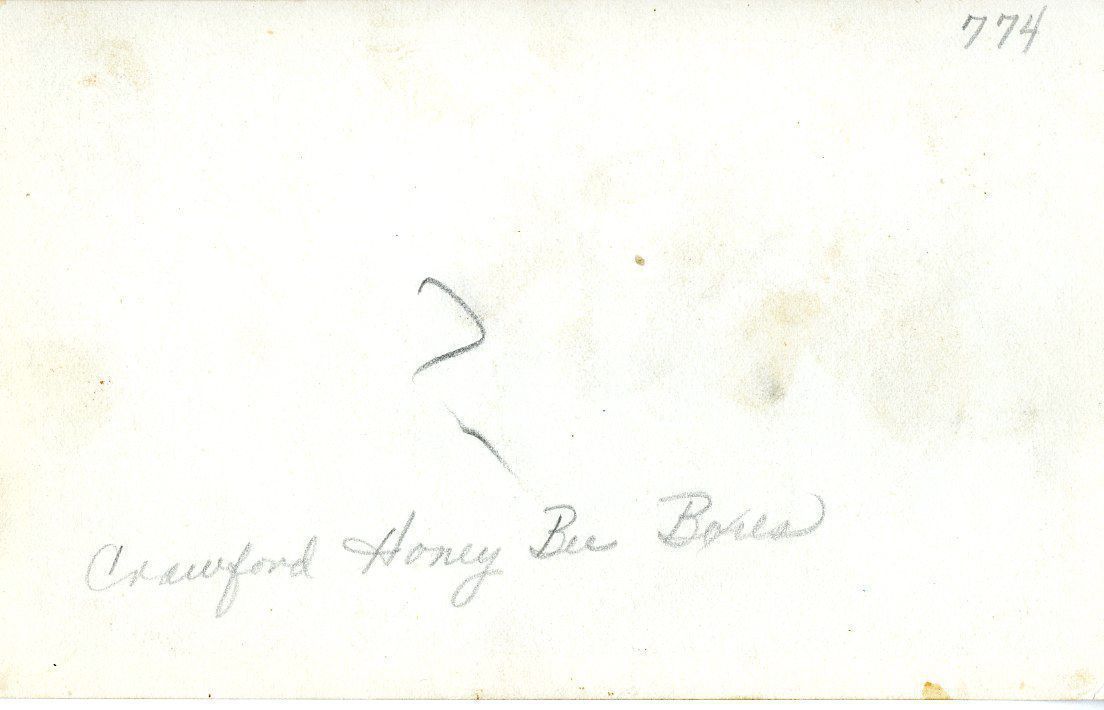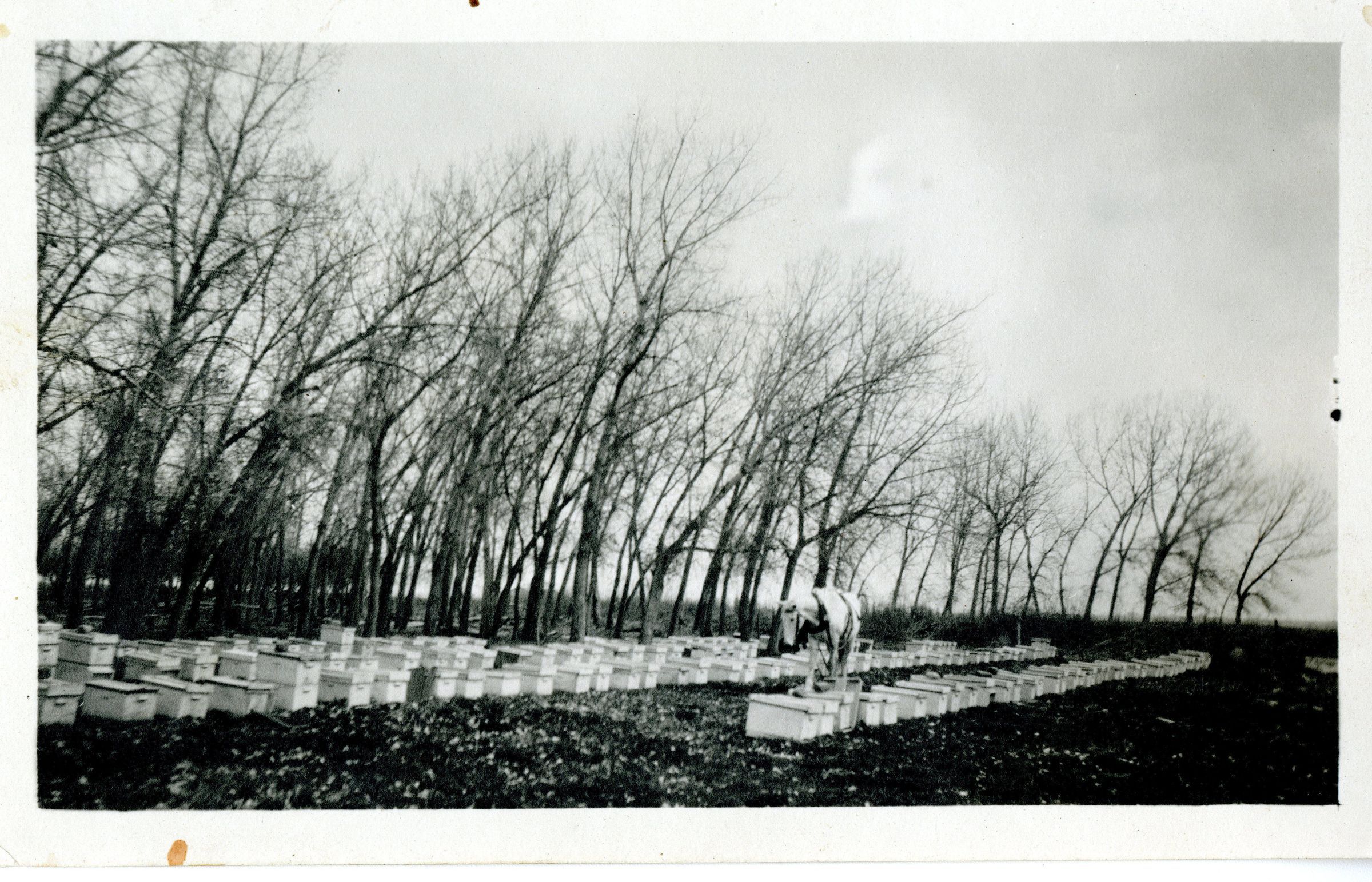 Photograph of the honey bee boxes on the Crawford Farm. There is a white horse in the center right of the image. Original