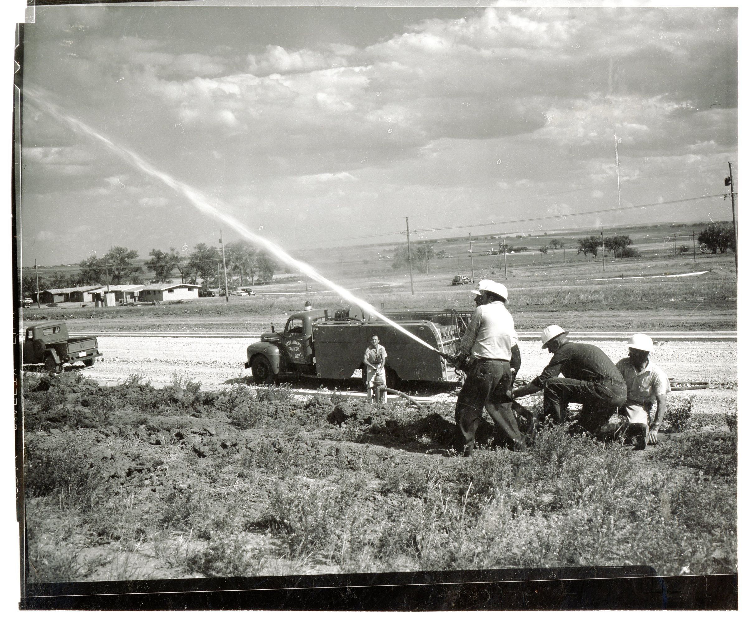 Five fireman srpaying a firehose next to a fire truck. West Adams Company fire department possibly testing firehoses.