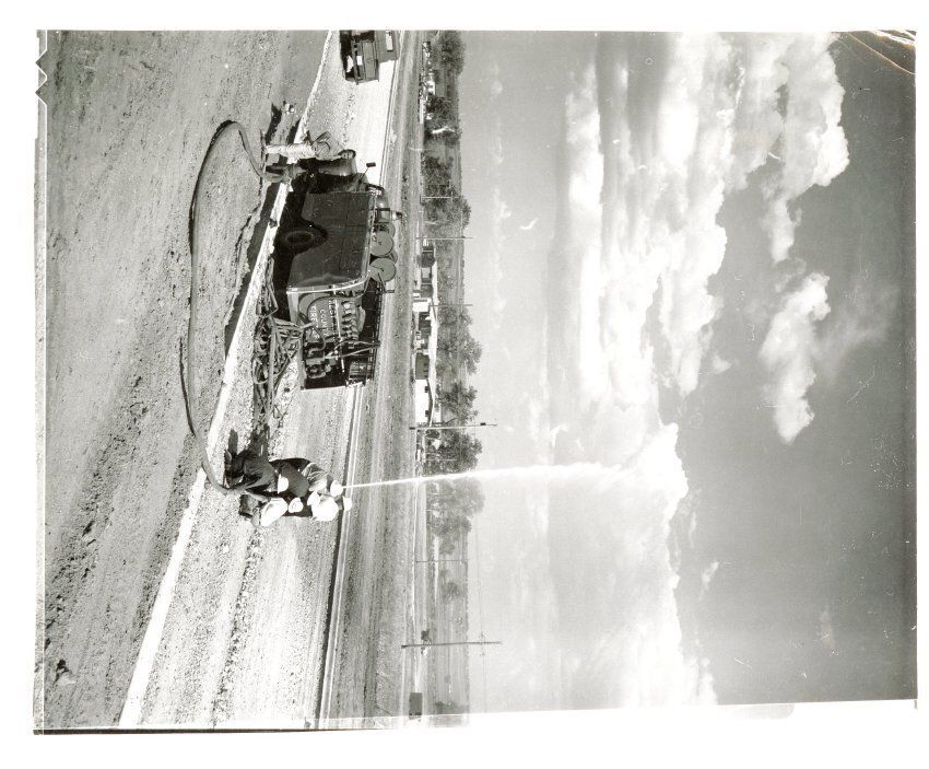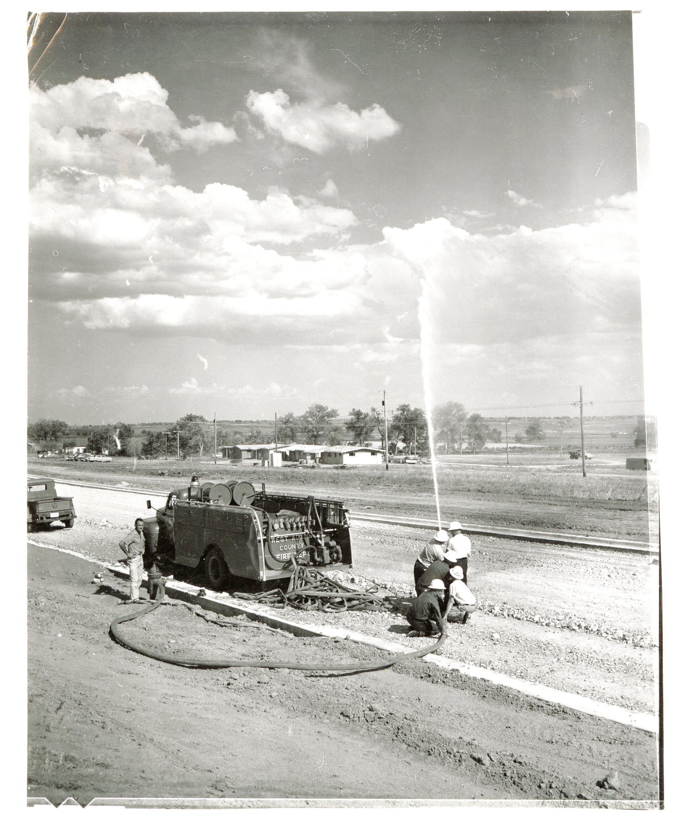 Five men from the West Adams fire department testing firehoused next to fire truck.