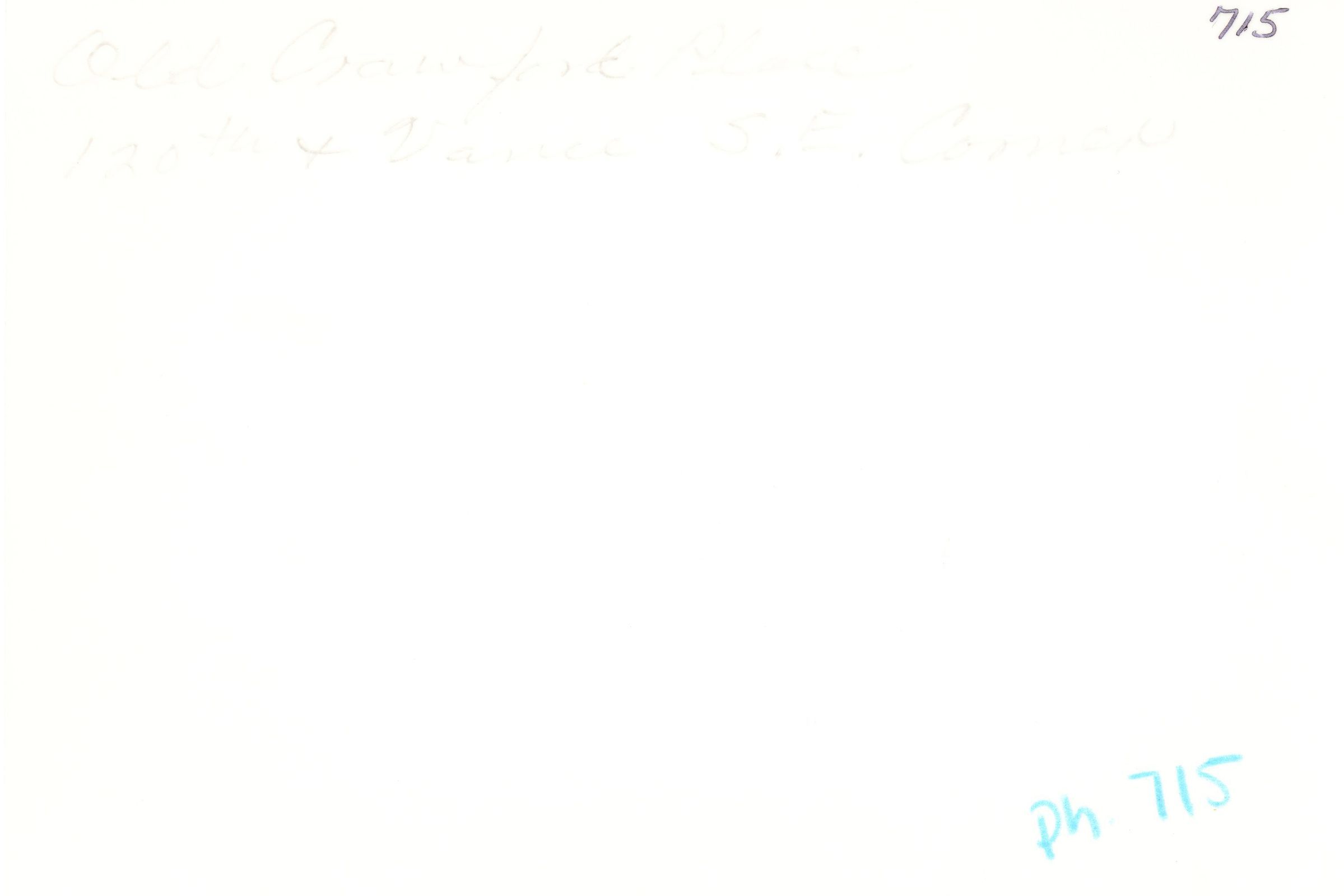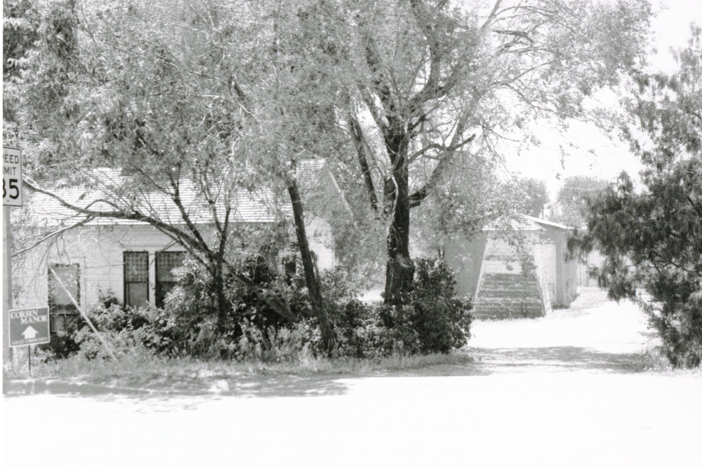 Black and white image showing the old Crawford residence off on120th and Vance S.E. Corner. Honey House at left. Clear photo of the pump house now next to the Depot. Speed limit sign of 35 shown on the far left side of image with a cabbin manor sign below it. Several trees mostly cover the Crawford place. The house is white and has many windows. The driveway on the far right of the image shows a possible garage or second house in the distance with tree sound it.