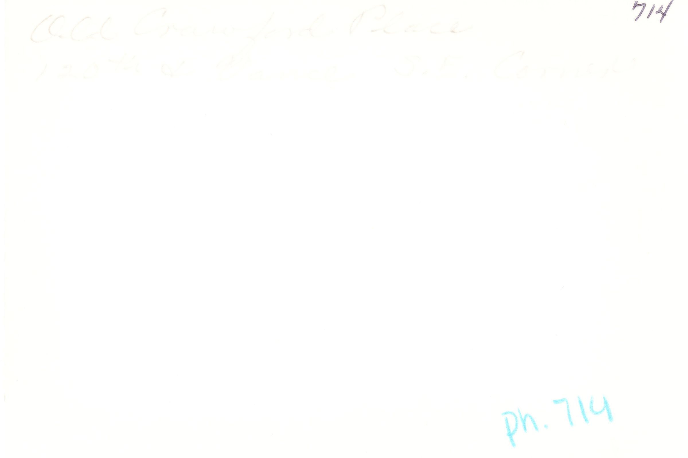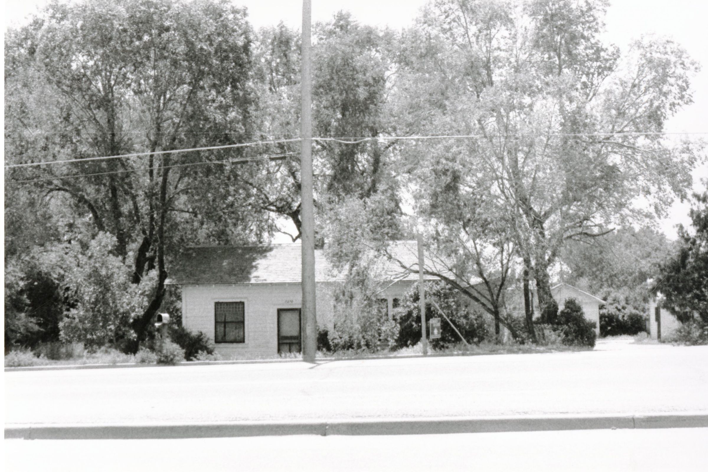 Distanced view of Harry Crawfords old place on 120th and Vance S.E. Corner. Honey House at left. Many tree surround the house. A door and a window and clearly seen on the front of the house facing 120th and Vance S.E. Corner. As well as the driveway leading right off of the road onto the Crawford property. A black and white picture. Crawford Farm. 120th at foreground.