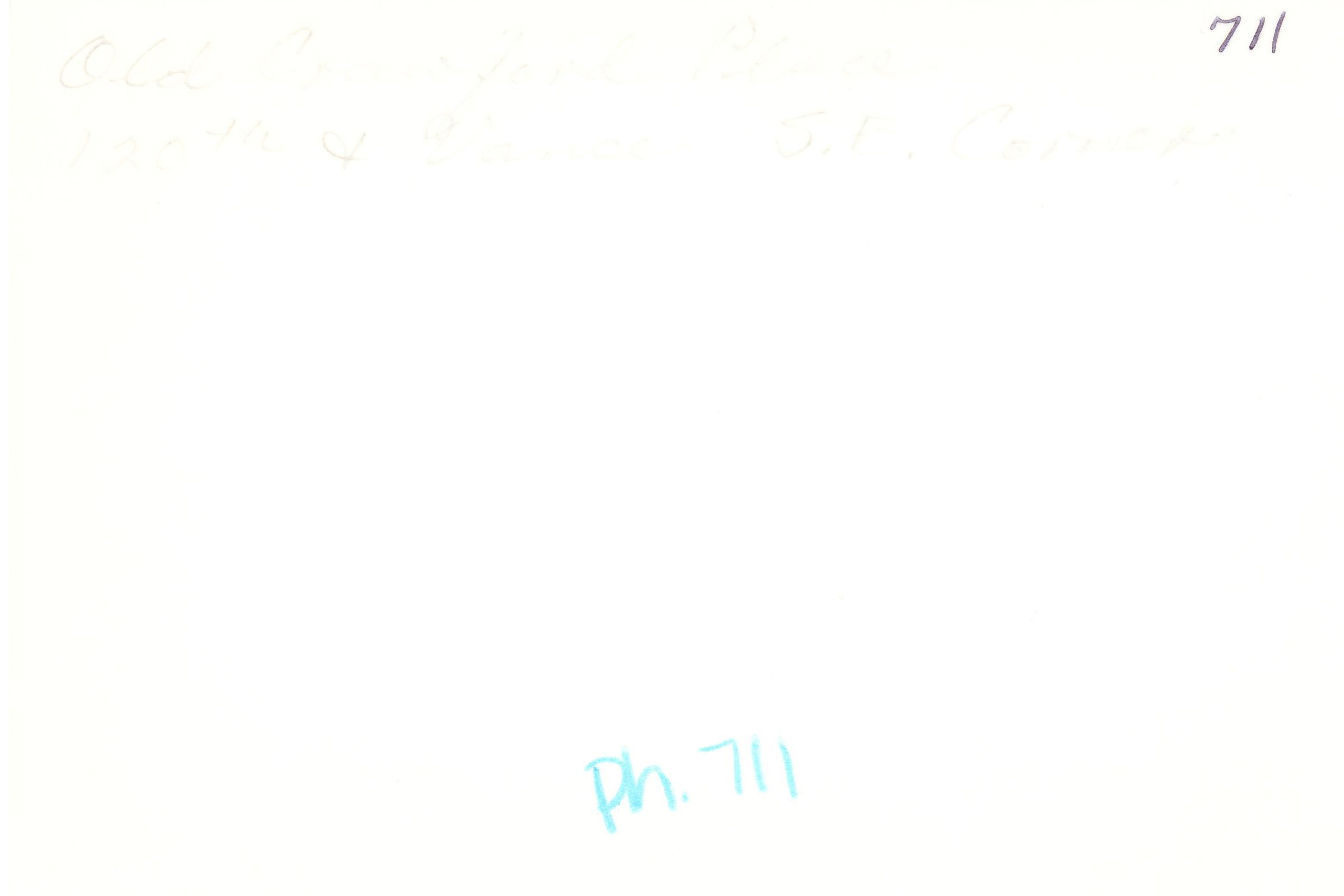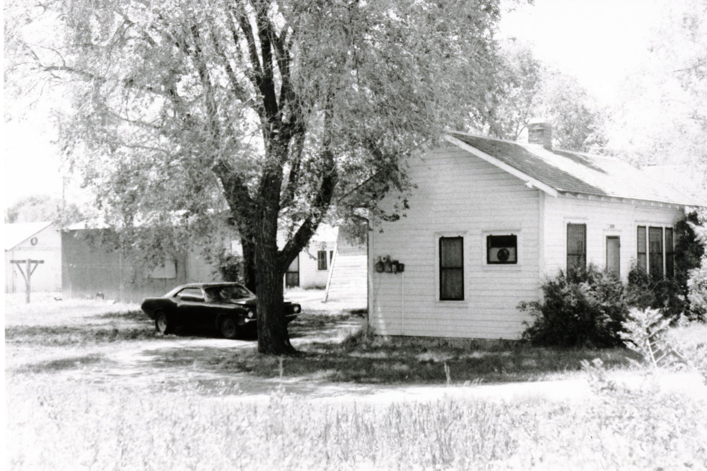 Black and white photograph. Side veiw of the Old Crawford place/farm, with Honey House at right and a 1970s car parked behind the building. The house is shown on the right side of the photo with 5 possibly 6 windows in view. A tree is placed right to the left of the house partly covering a car parked right behind the house. In the distance two other buildings are seen on the property. The front of the house is sovere in foliage. Was on 120th Ave.