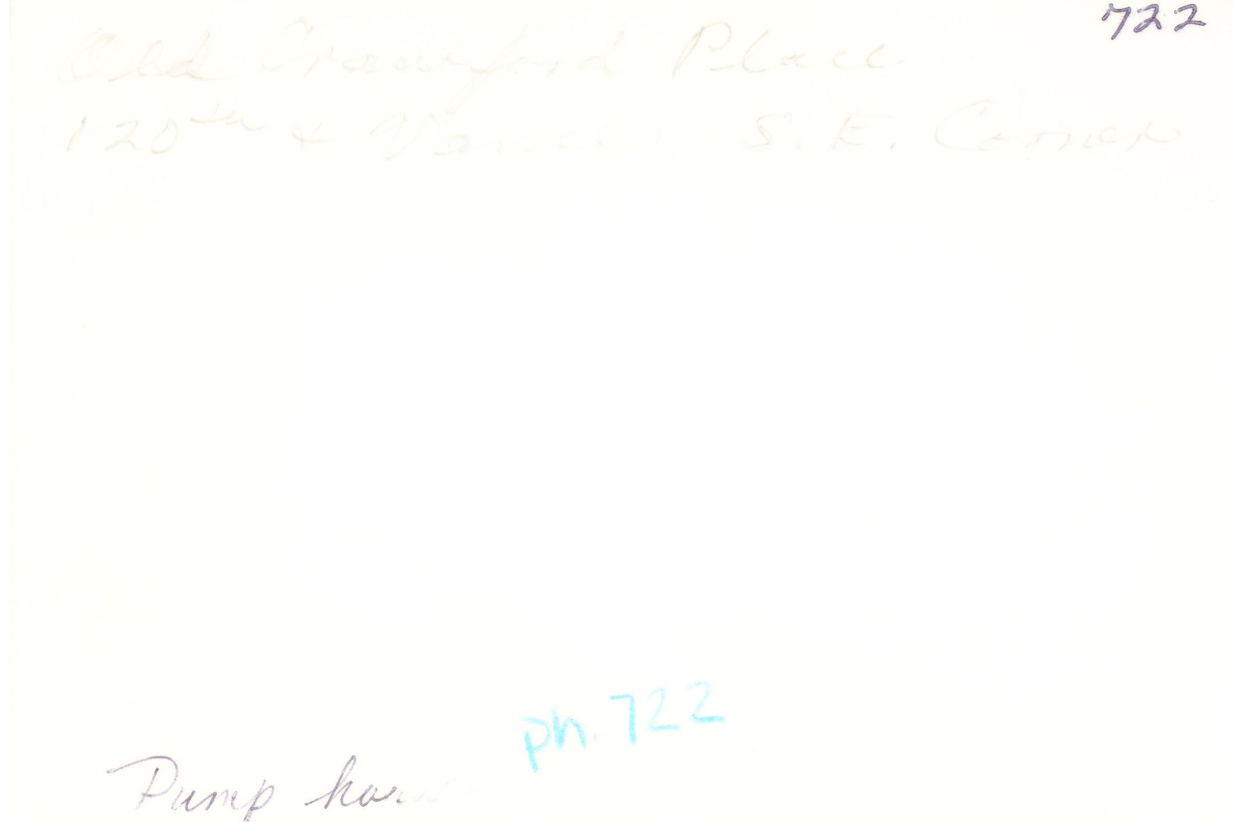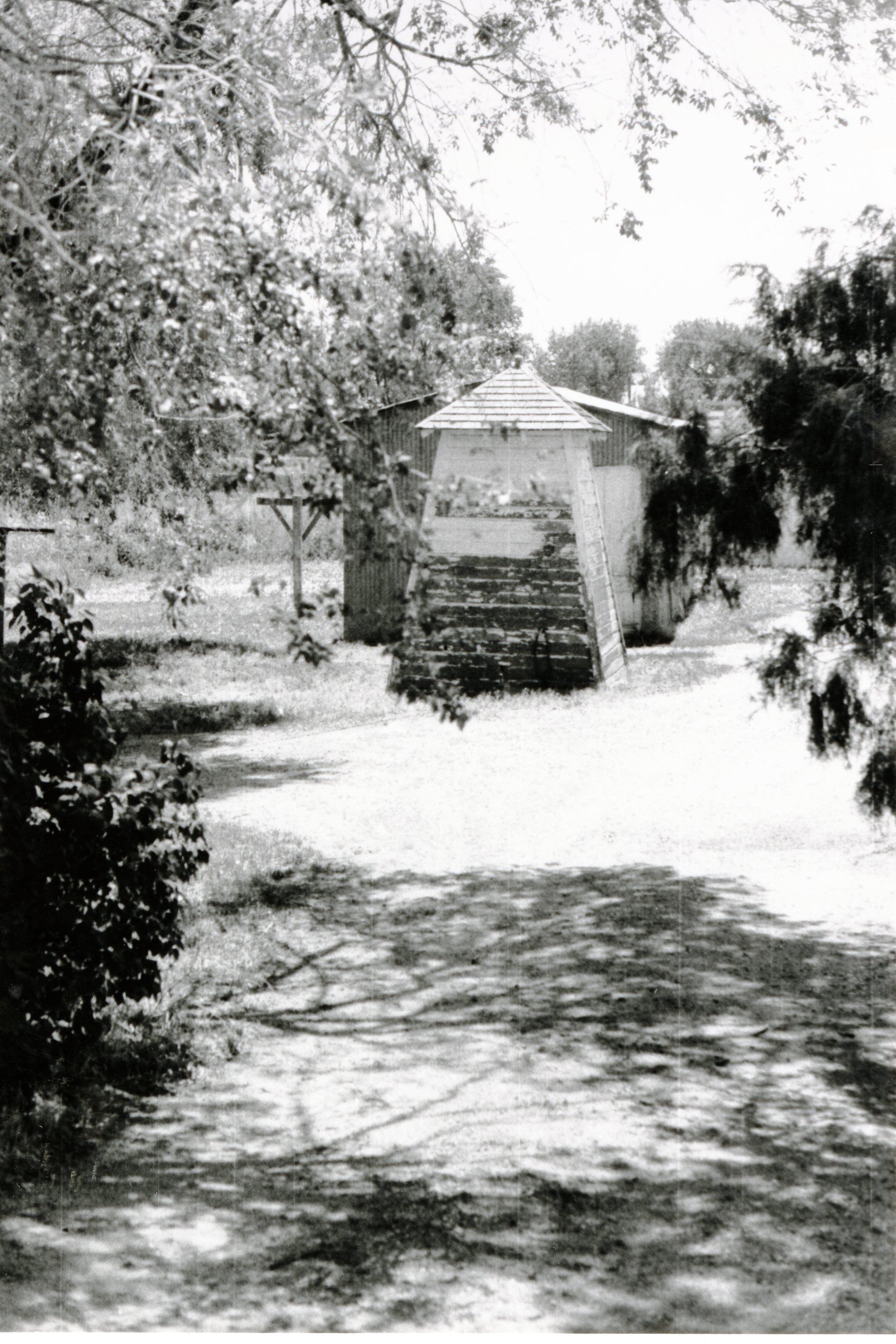 Pumphouse behind the Crawford Farm House in its original location on 121. Clothesline visible to left and a corragaded metal building is visible behind pumphouse. Pumphouse was located to Zang Spur Park in 1996.