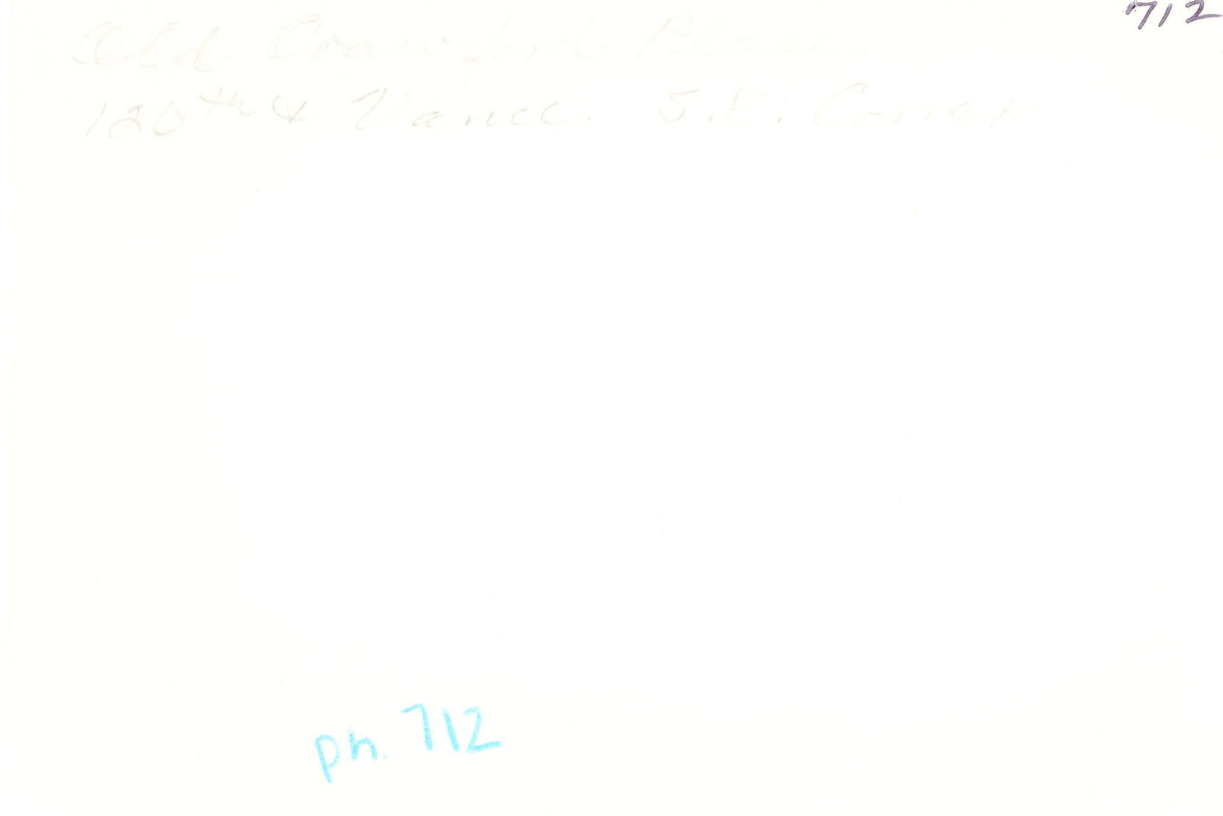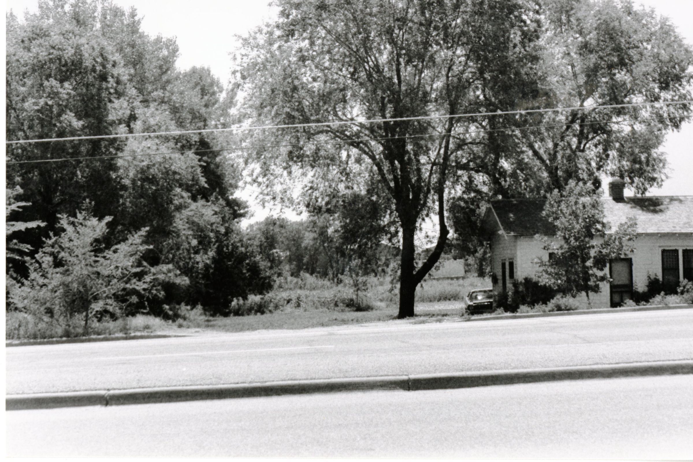 Black and white photograph of the Honey House in its original location on the Crawford Farm at 120th and Vance S.E. Corner. Mostly foliage is show on the far left into the center of the picture. The Old Crawford Place is shown on the right side of the image. A dark car is also shown behind the house. 120th in foreground.